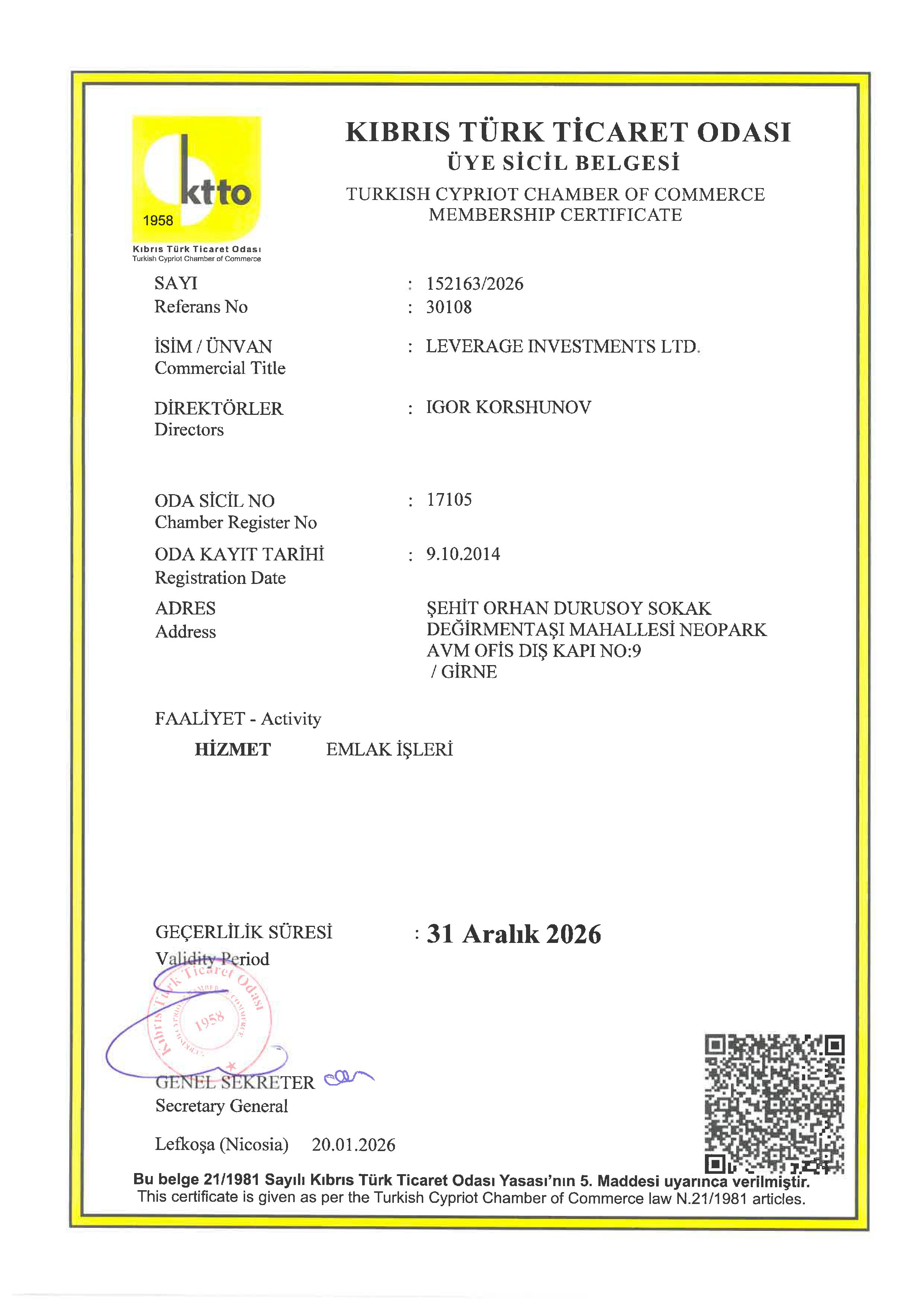 От лица генерального директора компании «Leverage Investments ltd» Игоря Владимировича Коршунова настоятельно рекомендуем Вам запрашивать аналогичные документы у всех агентств по продаже недвижимости на Северном Кипре, услугами которых Вы решите воспользоваться.