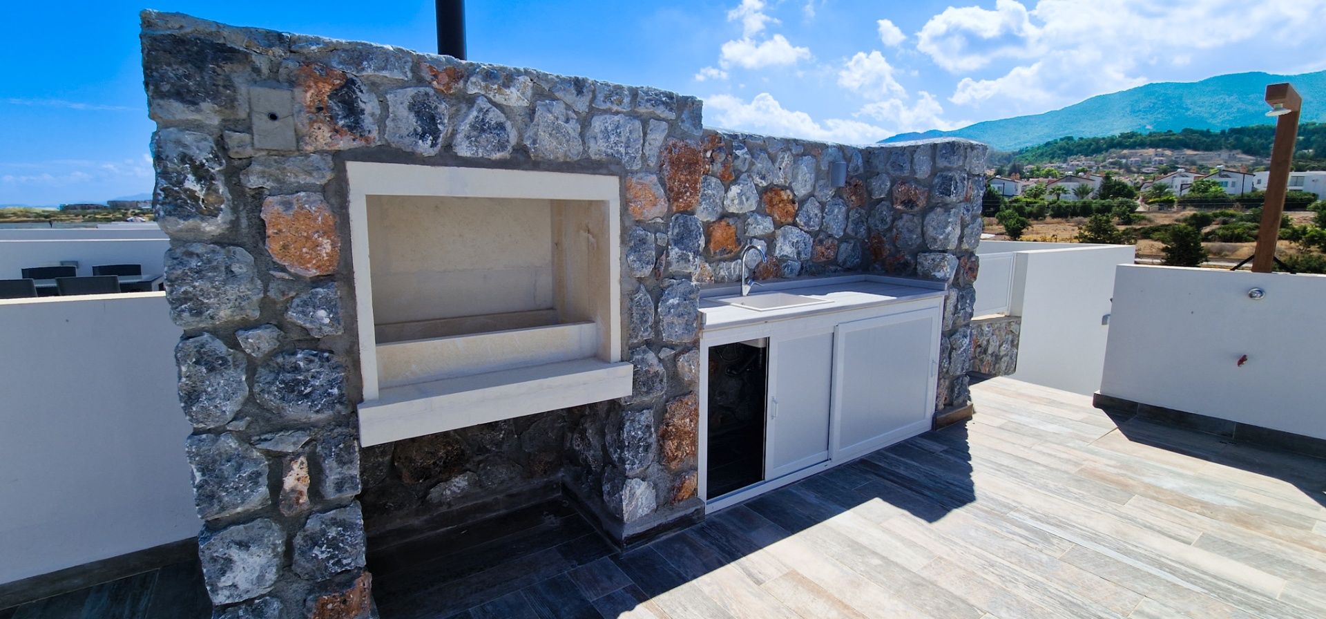 На частной террасе установлен частный бассейн 12 м² с подсветкой и системой циркуляции воды, а также предусмотрено: зона барбекю, полноценная кухонная зона с каменной столешницей, раковиной, водой, холодильником и местами для хранения. Есть отдельная техническая зона, где размещено оборудование для кондиционеров.