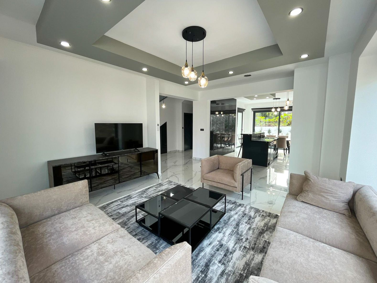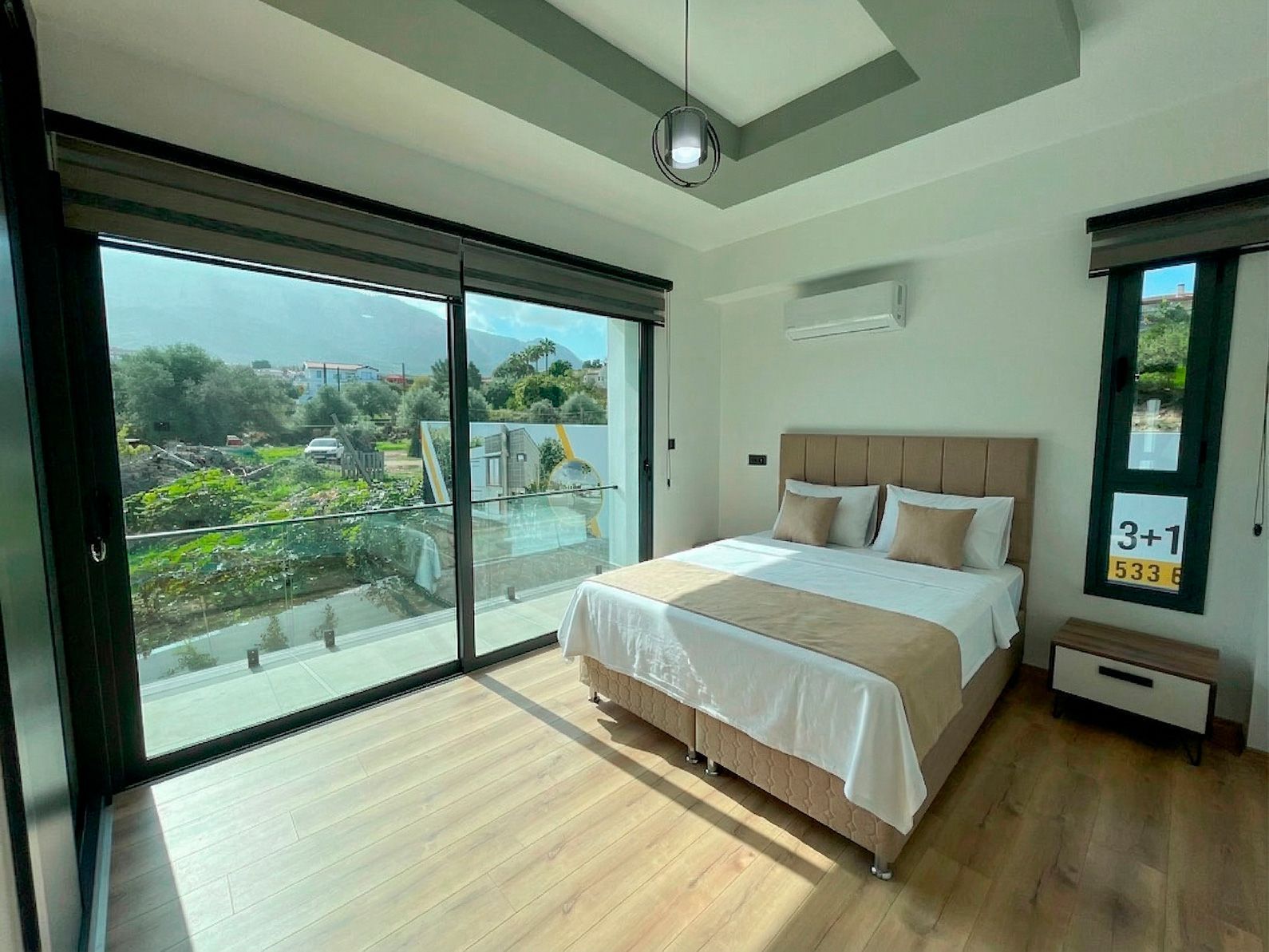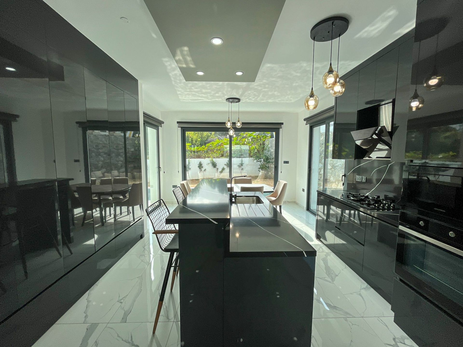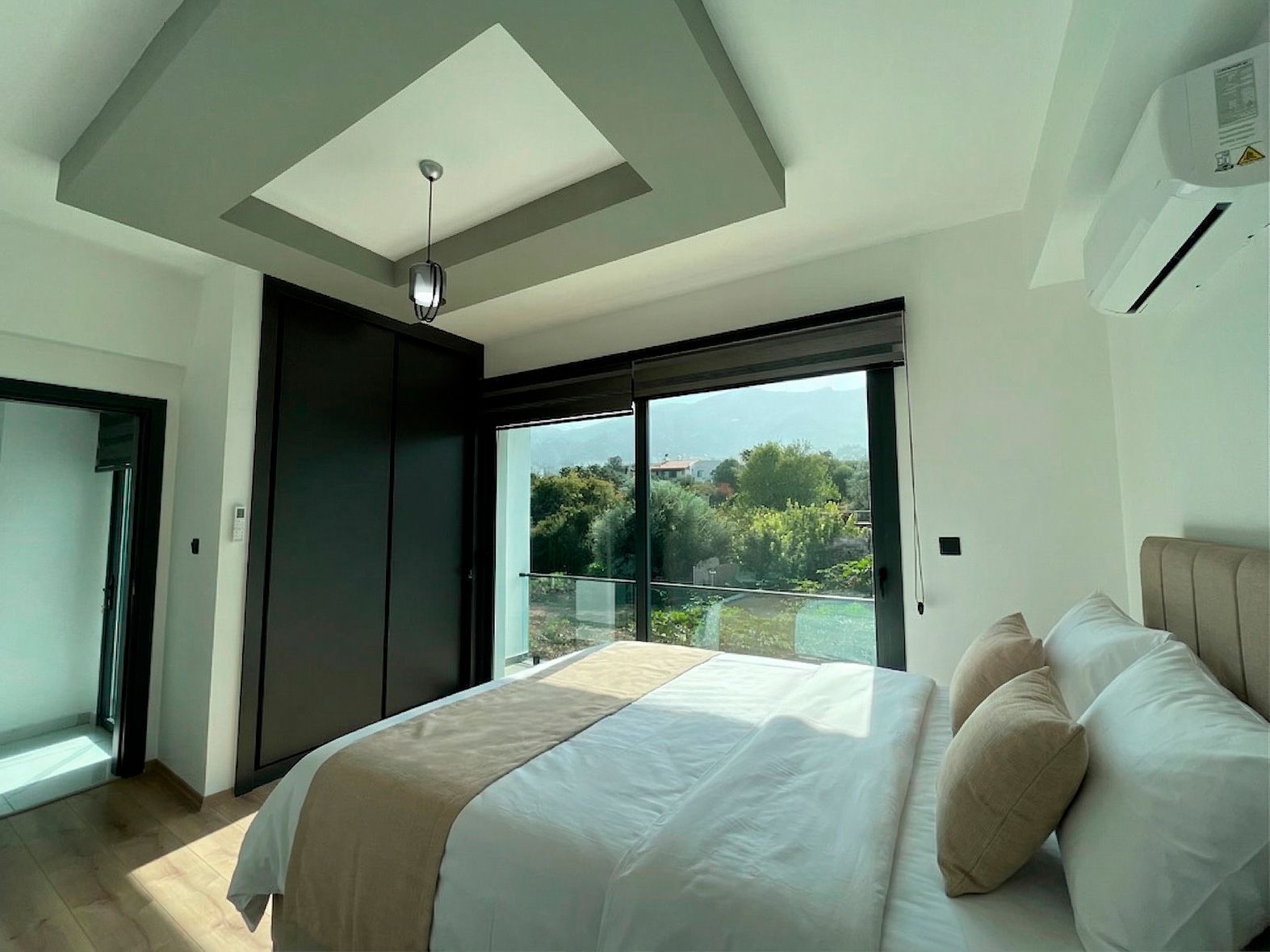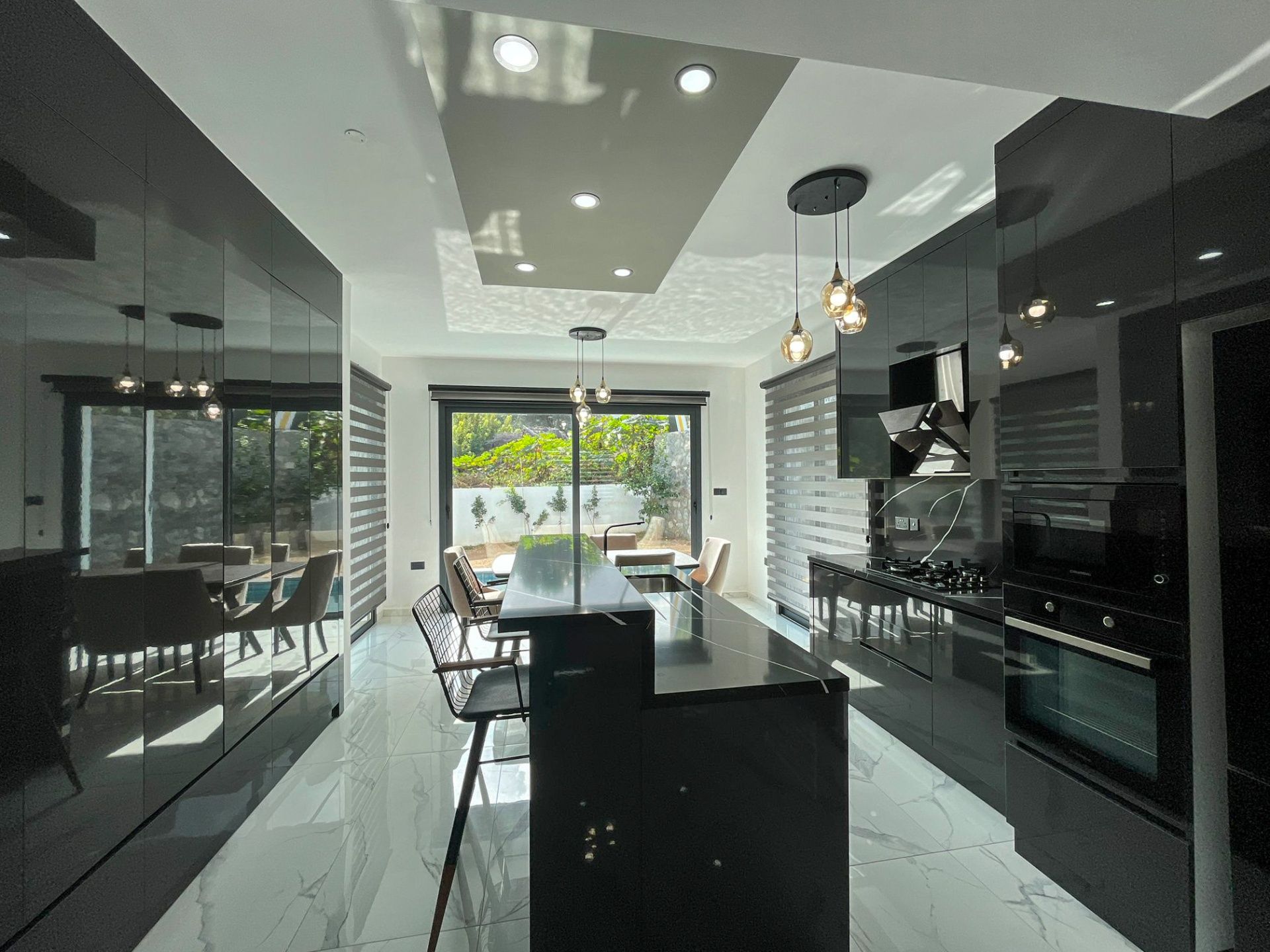 На участке есть бассейн, зелёный сад и парковка. Входит в небольшой комплекс из шести вилл, каждая из которых ограждена собственным забором, что обеспечивает дополнительную приватность. Расположение удобное: поблизости вся городская инфраструктура, магазины, рестораны, а до центра Кирении можно добраться за считаные минуты.