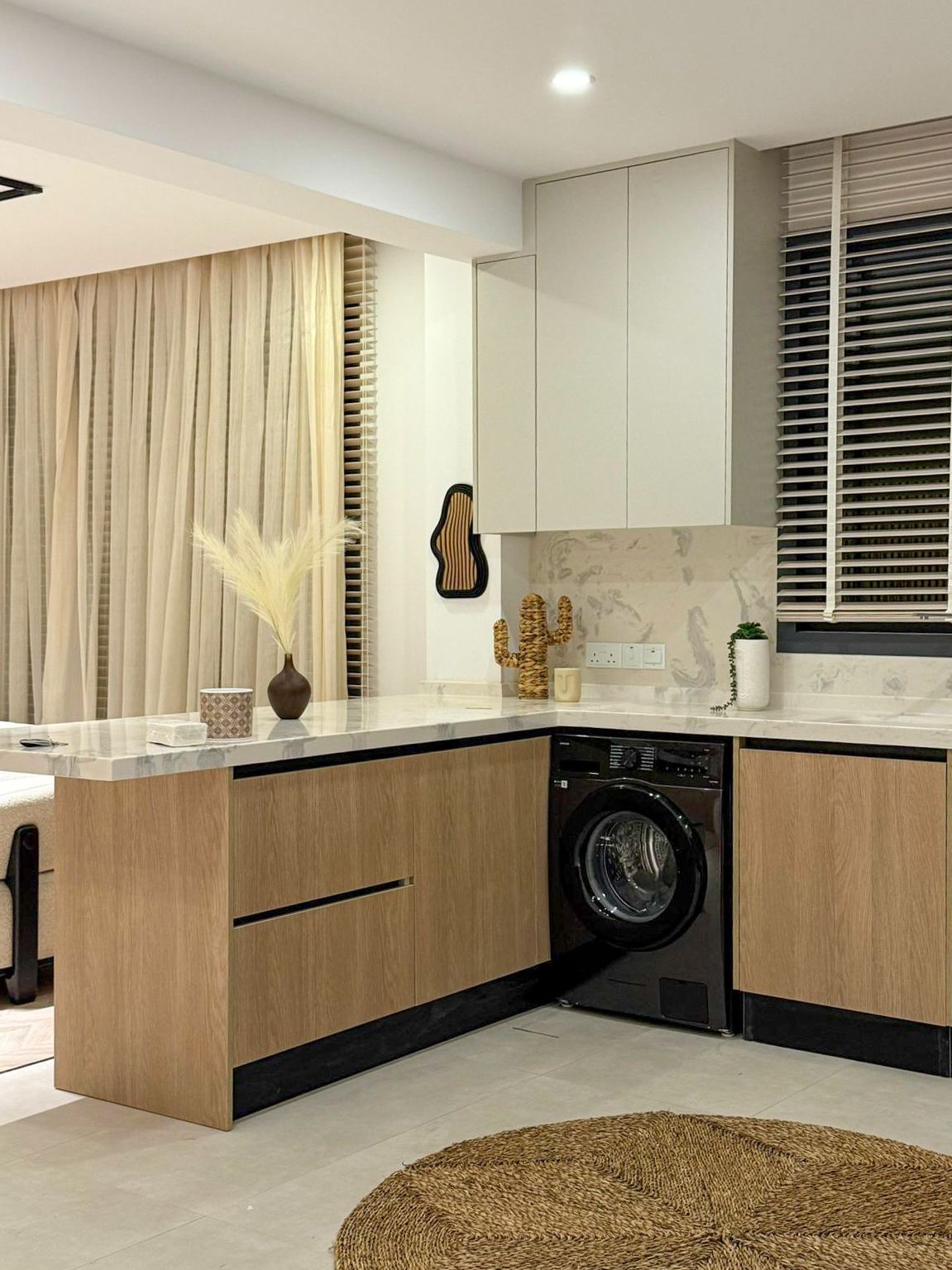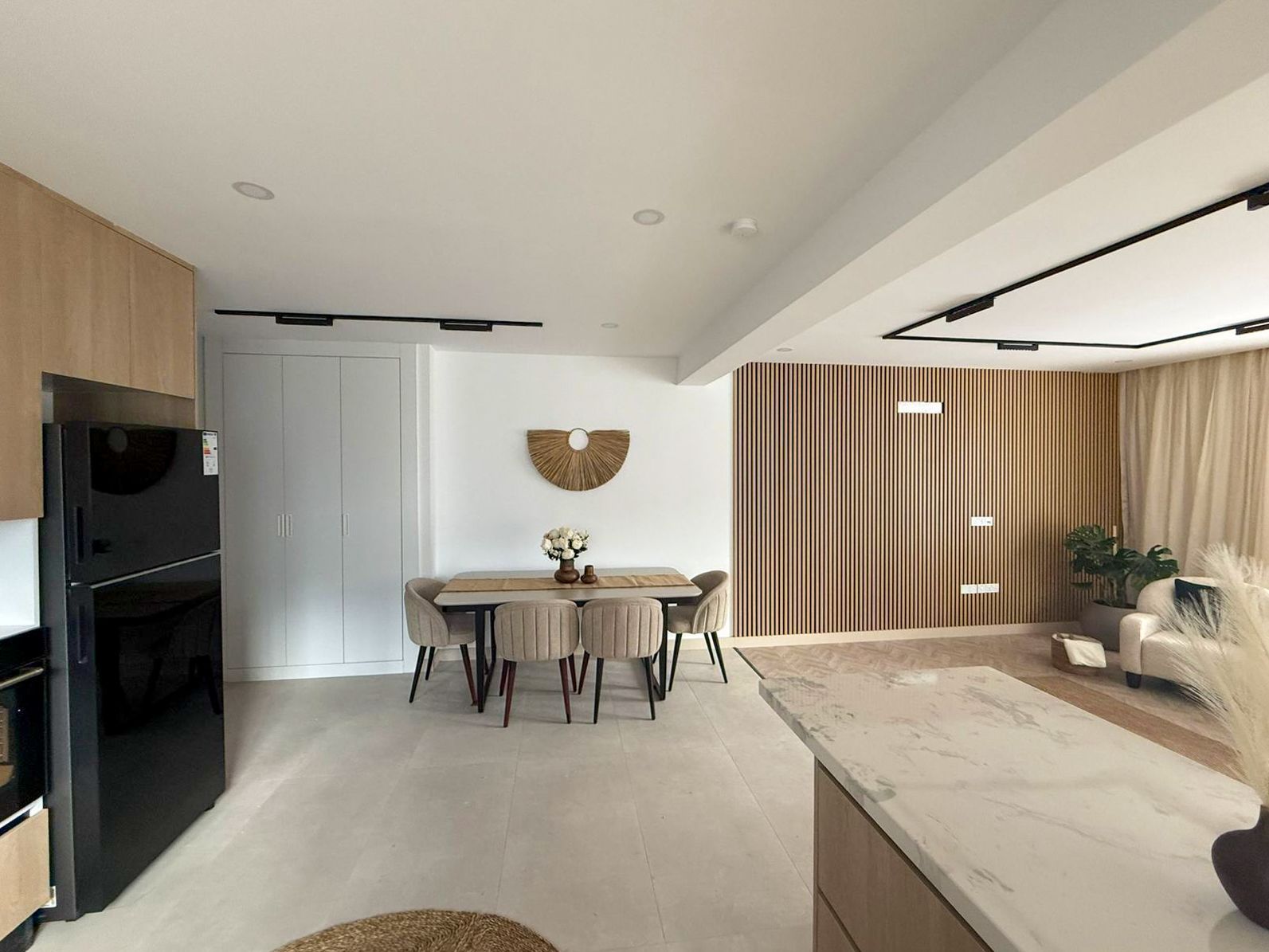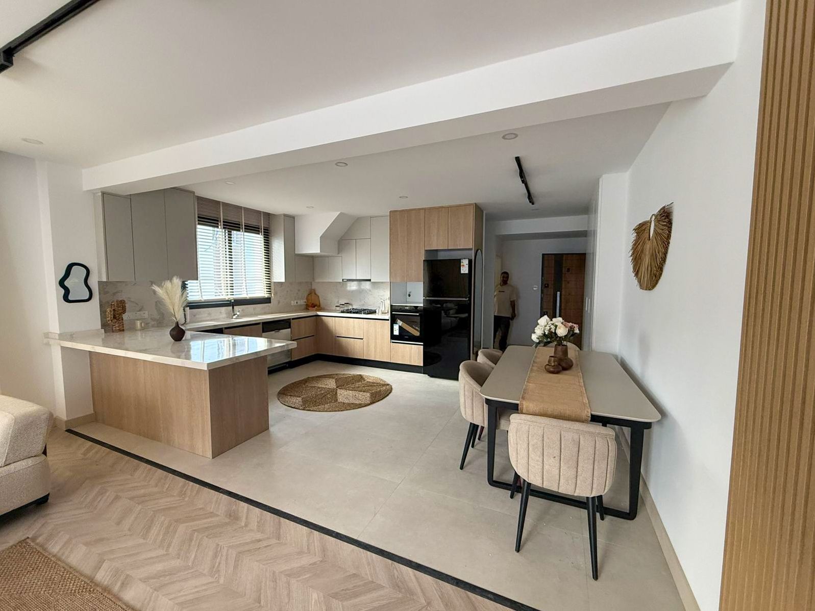 Двухэтажные 4-комнатные апартаменты общей площадью 120 м² с собственной террасой на крыше. Жилая площадь составляет около 120 м², включая балкон 6 м². На первом этаже расположена кухня-гостиная с выходом на балкон, одна спальня и гостевой санузел. На втором этаже находятся ещё две спальни: гостевая и мастер-спальня с собственным санузлом. Из квартиры по лестнице есть прямой выход на приватную террасу на крыше.