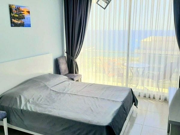 Студия 32м2 идеально подходит для комфортного проживания. Полностью оборудованная кухня с варочной панелью, вытяжкой, микроволновкой, электрическим чайником и холодильником. Спальня с большой кроватью и панорамными окнами, через которые открывается потрясающий вид на море.