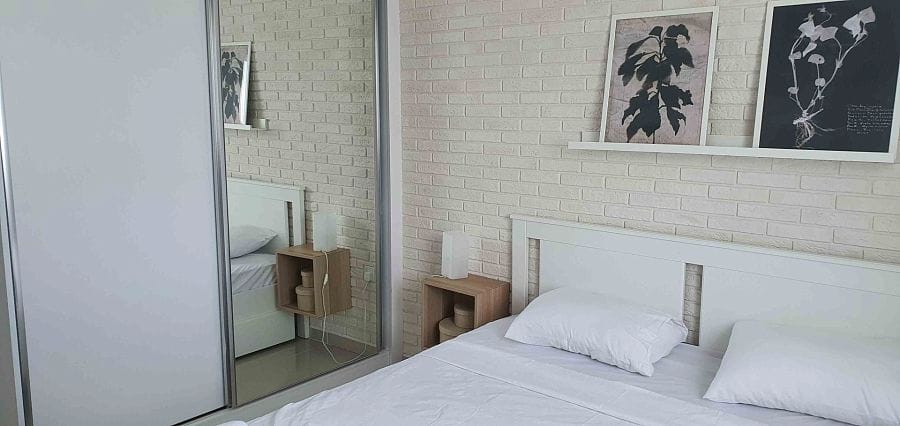 Из гостиной есть выход на террасу с обеденной зоной, где установлен стол и стулья из ротанга. Терраса просторная, с видом на внутренний двор и бассейн. Спальня оформлена в мягких пастельных тонах, есть большая двуспальная кровать с прикроватными тумбами, шкаф-купе и небольшой туалетный столик с зеркалом.