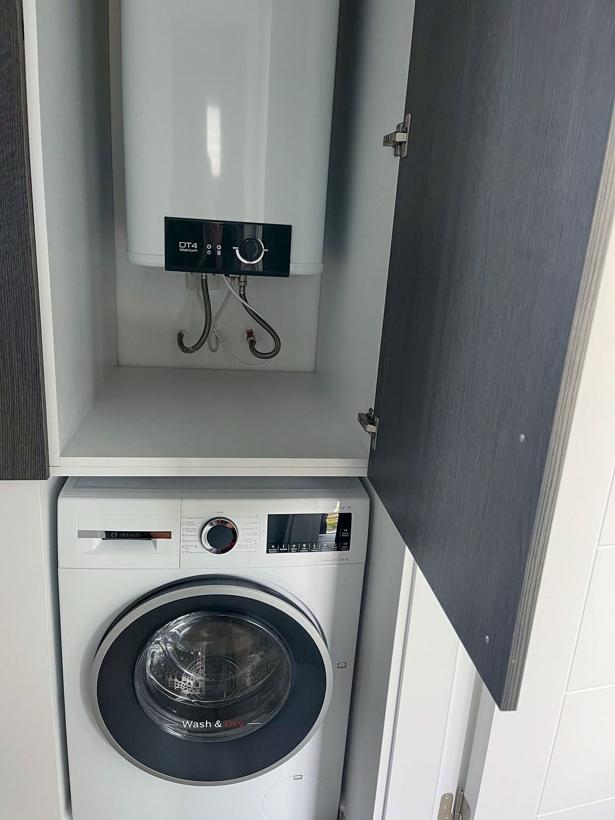 Обе спальни обставлены кроватями с новыми матрасами, прикроватными тумбами и гардинами. В небольшом коридоре предусмотрен вместительный шкаф, внутри которого аккуратно размещены стиральная машина и бойлер Bosch. Подключение коммуникаций включены в цену.