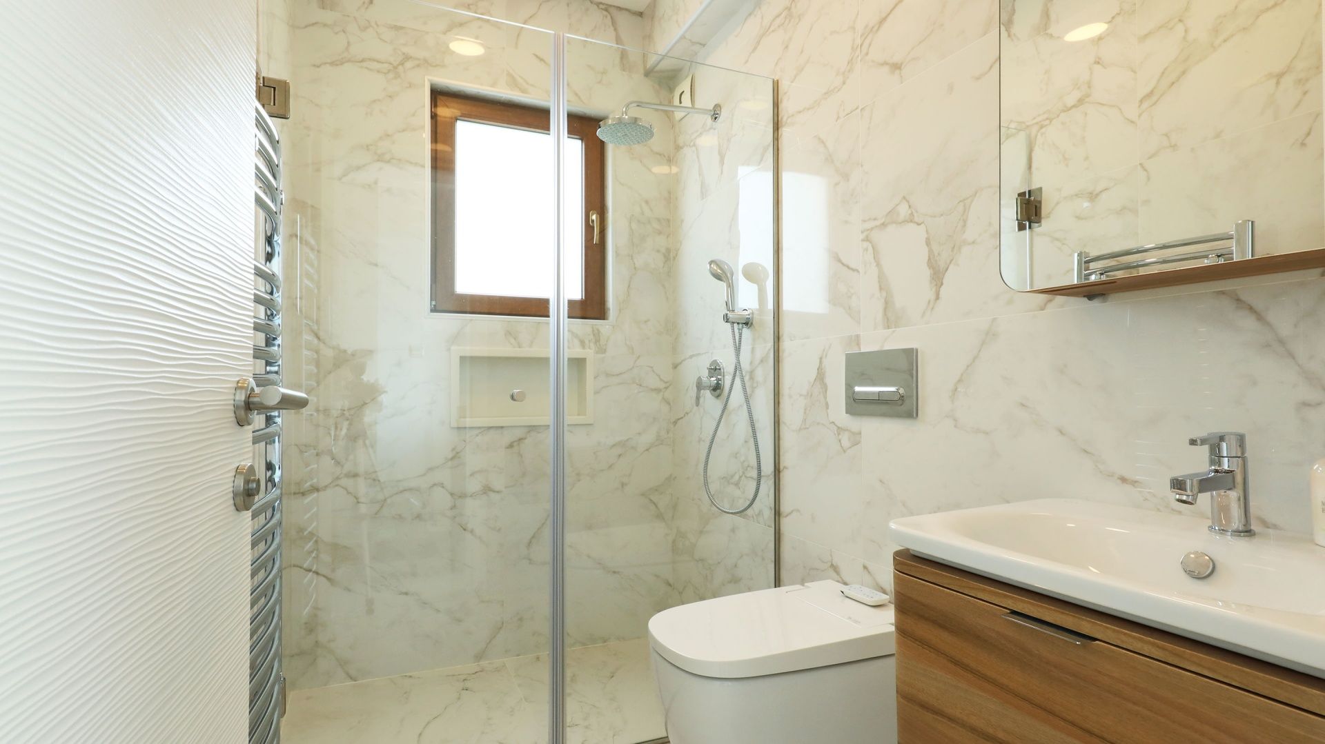 В гостиной установлен тёплый пол. Здесь стоит кожаный диван, два кресла итальянского бренда Natuzzi и телевизор Samsung 55” 4K. Из больших окон открывается красивый вид на море, которым можно любоваться, не вставая с дивана. Кухня оборудована современной техникой: тихим холодильником LG, варочной панелью, духовкой и микроволновой печью.