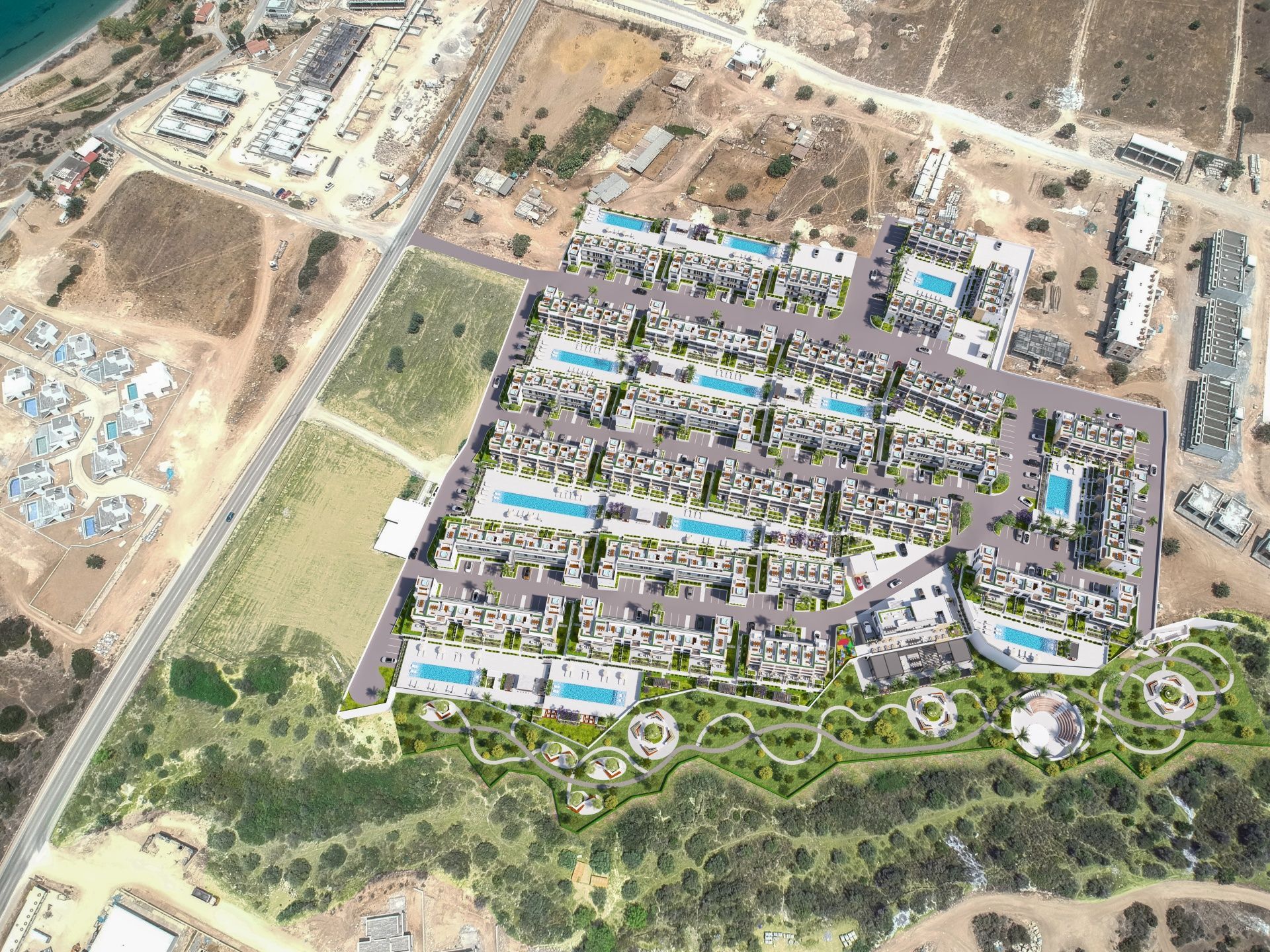 Комплекс расположен в живописном районе Татлысу, всего в пяти минутах ходьбы от моря. Это современный проект, объединяющий комфорт, природу и развитую инфраструктуру. До центра Кирении можно доехать за 30 минут, а путь до аэропорта займёт около часа.