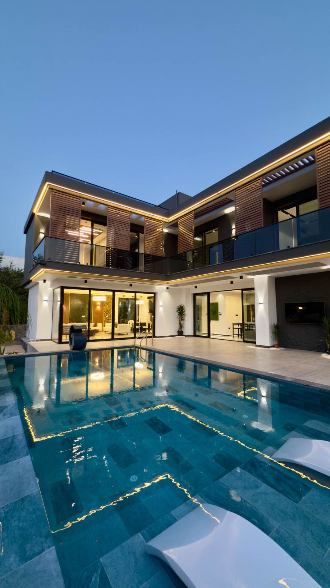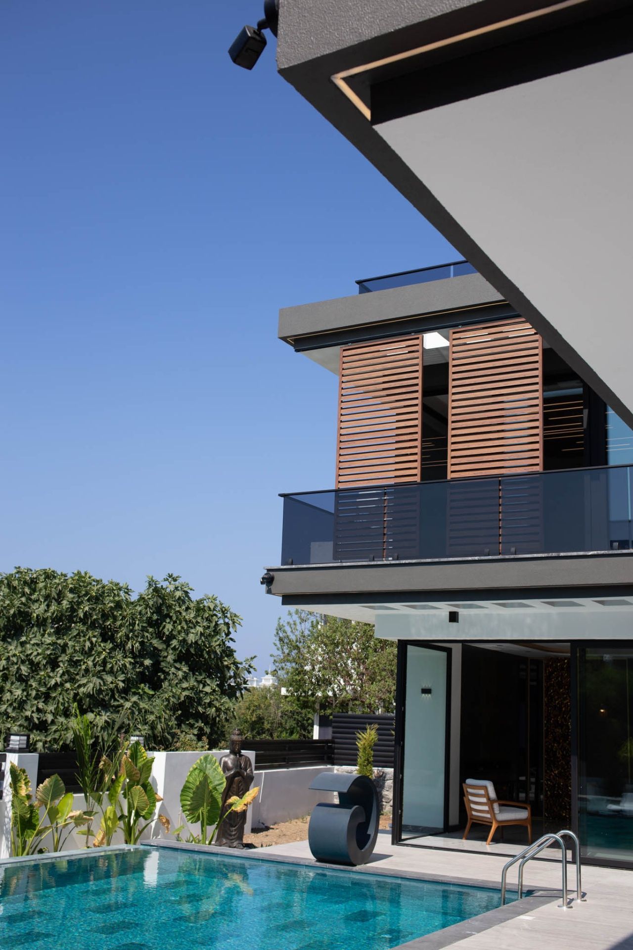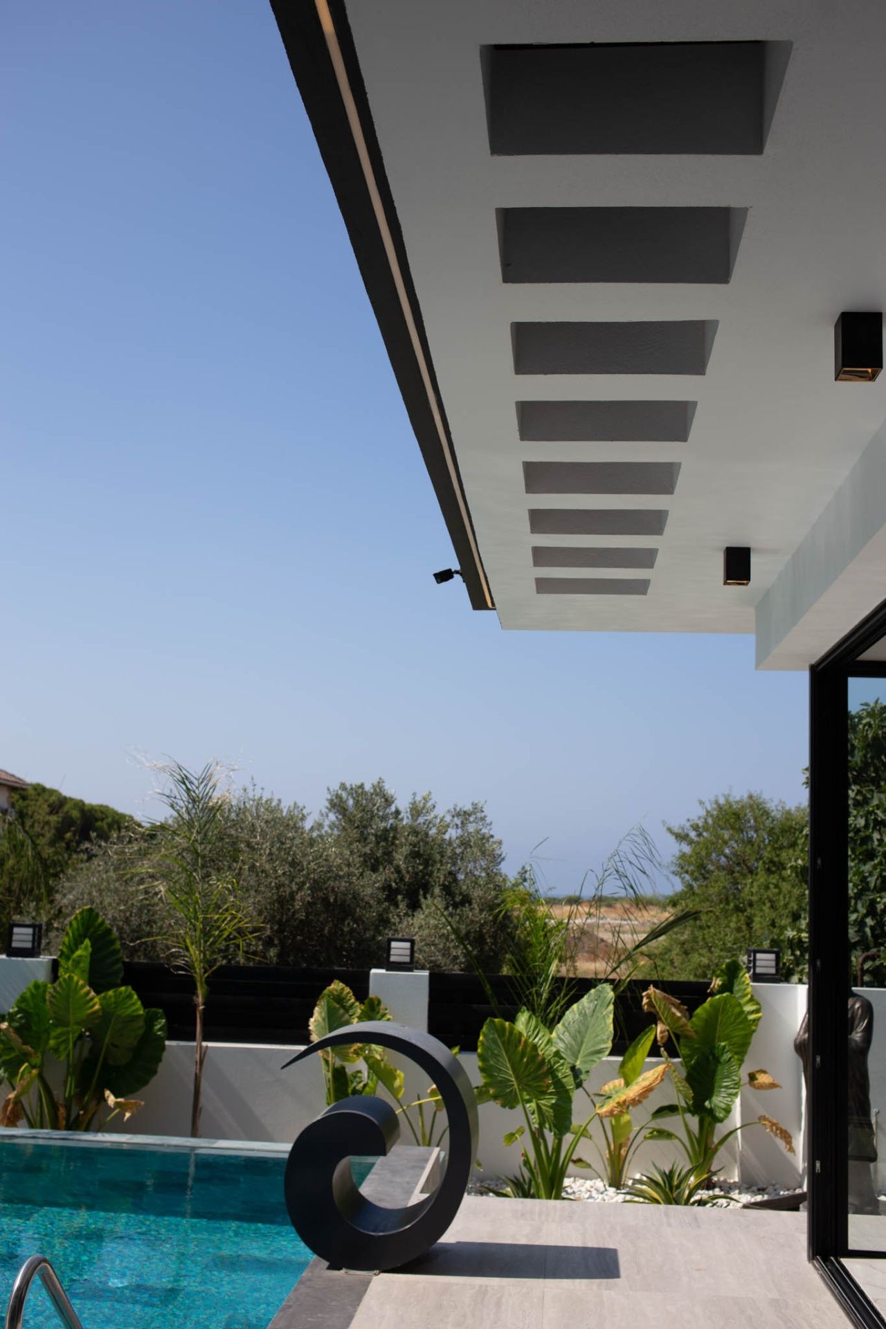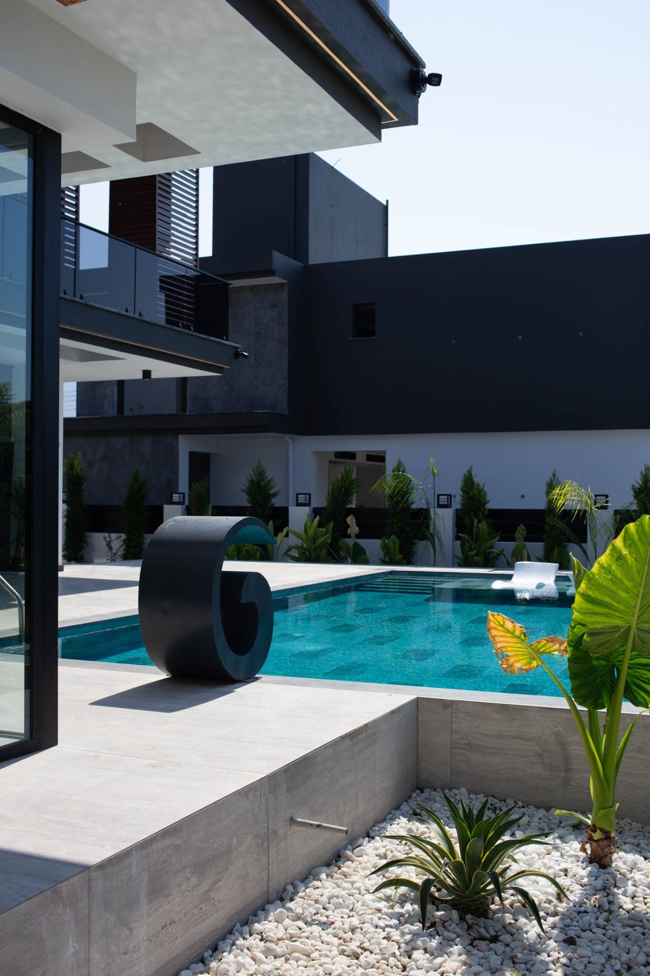 На участке есть частный бассейн с оптоволоконной подсветкой, встроенными лежаками и автоматической системой очистки. Он выглядит особенно эффектно вечером, отражая свет от фасада. Рядом оборудована зона для барбекю и обедов на свежем воздухе, а за счёт ландшафтного дизайна участок остаётся полностью приватным.