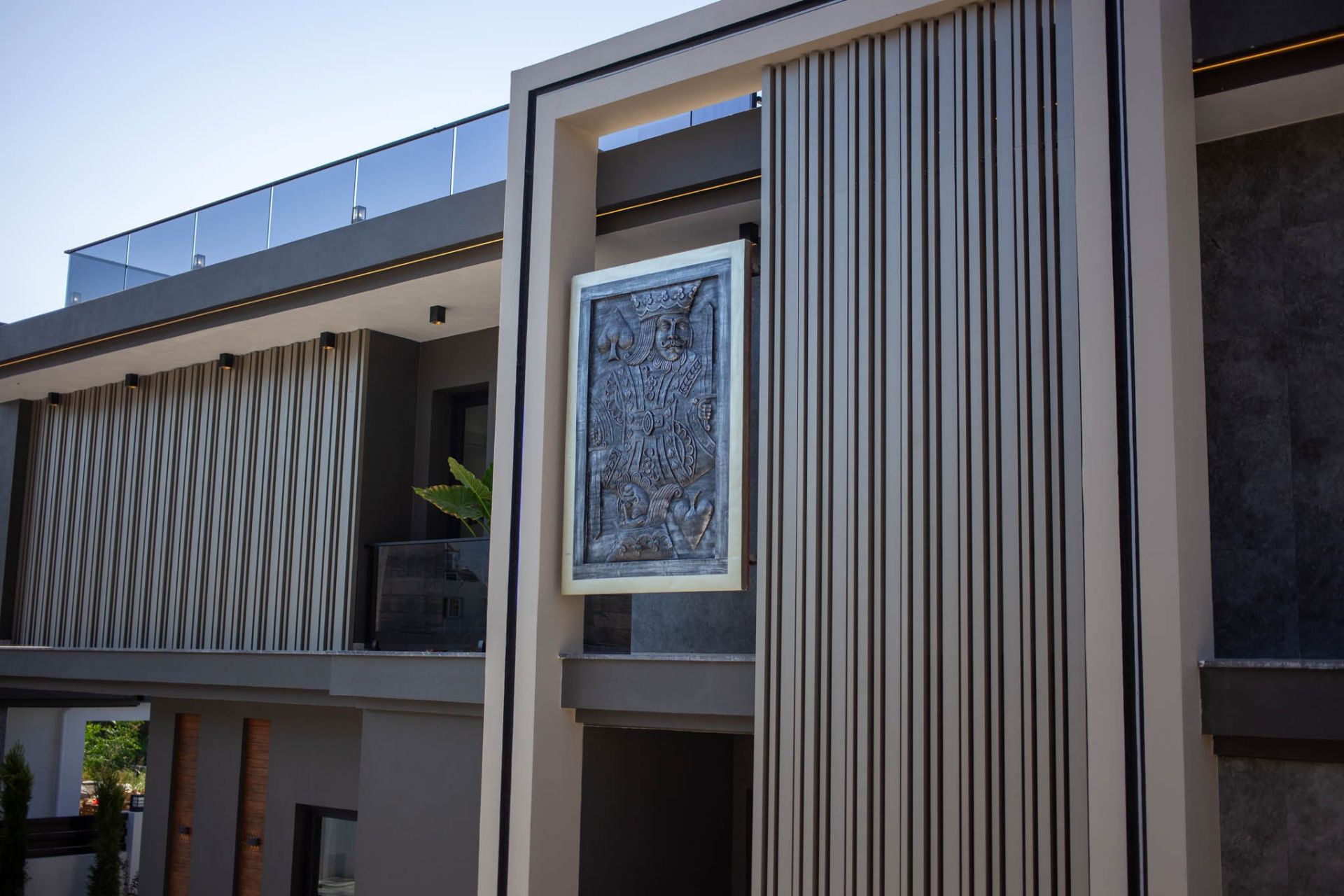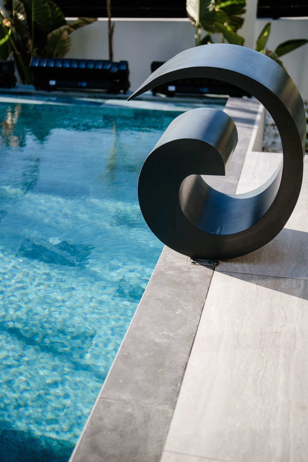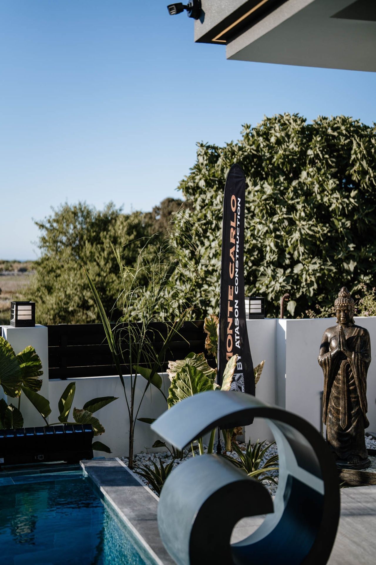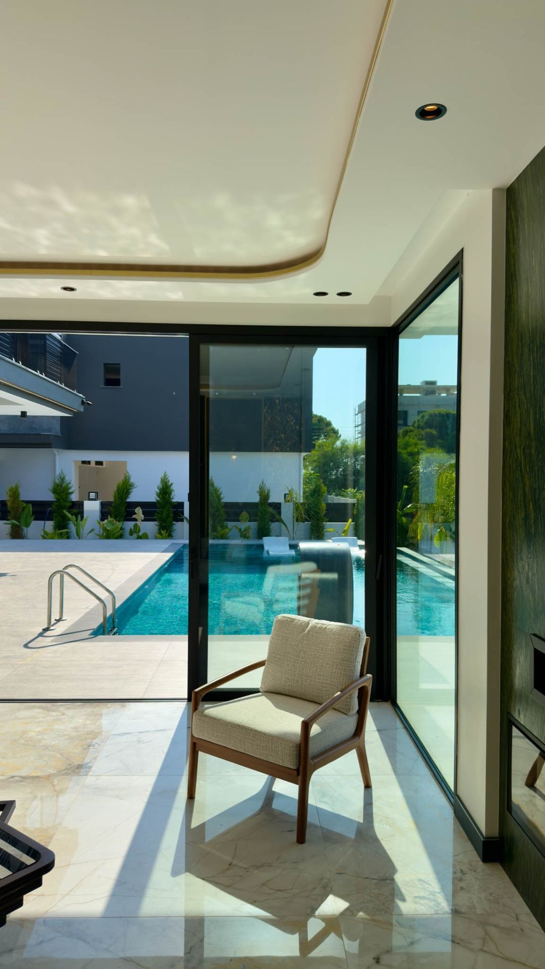 На участке есть частный бассейн с оптоволоконной подсветкой, встроенными лежаками и автоматической системой очистки. Он выглядит особенно эффектно вечером, отражая свет от фасада. Рядом оборудована зона для барбекю и обедов на свежем воздухе, а за счёт ландшафтного дизайна участок остаётся полностью приватным.