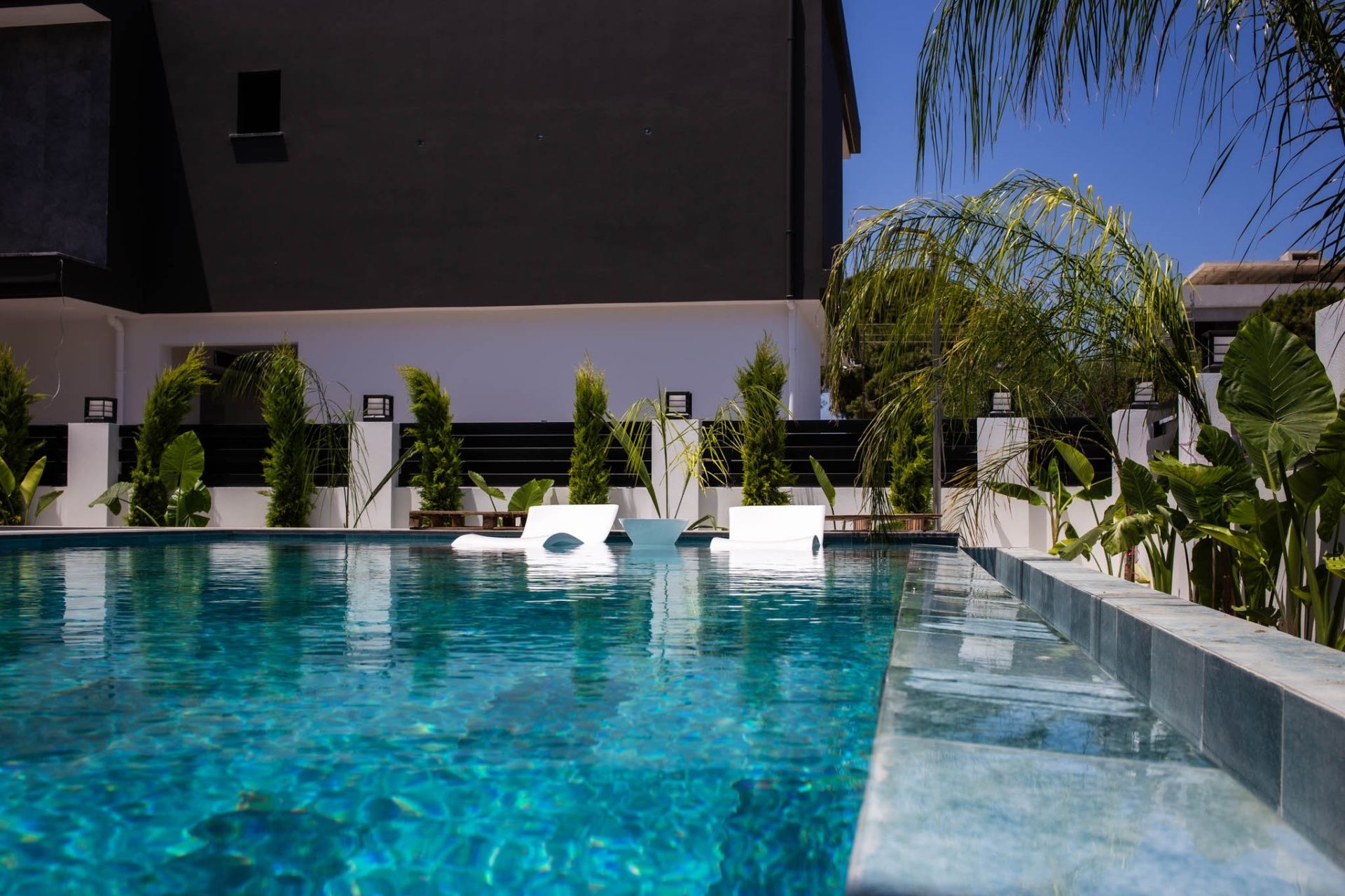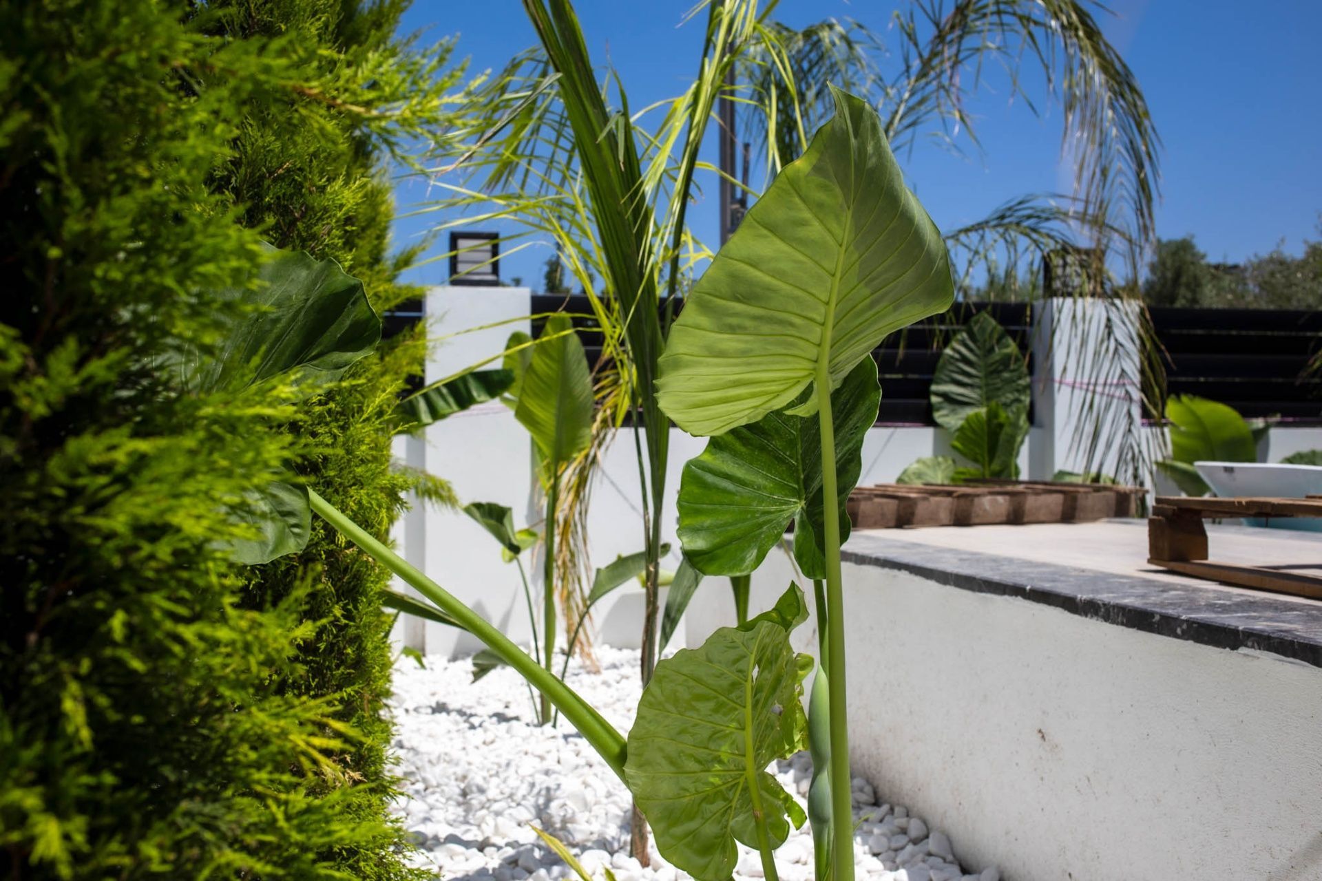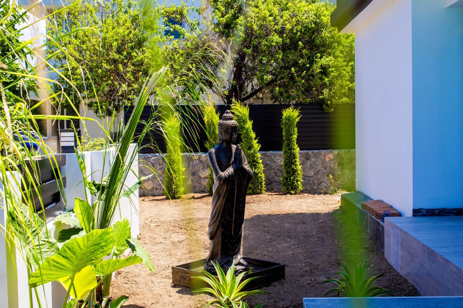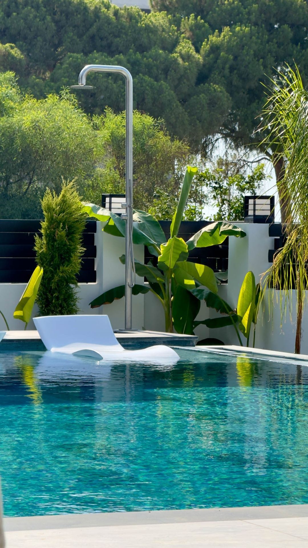 На участке есть частный бассейн с оптоволоконной подсветкой, встроенными лежаками и автоматической системой очистки. Он выглядит особенно эффектно вечером, отражая свет от фасада. Рядом оборудована зона для барбекю и обедов на свежем воздухе, а за счёт ландшафтного дизайна участок остаётся полностью приватным.