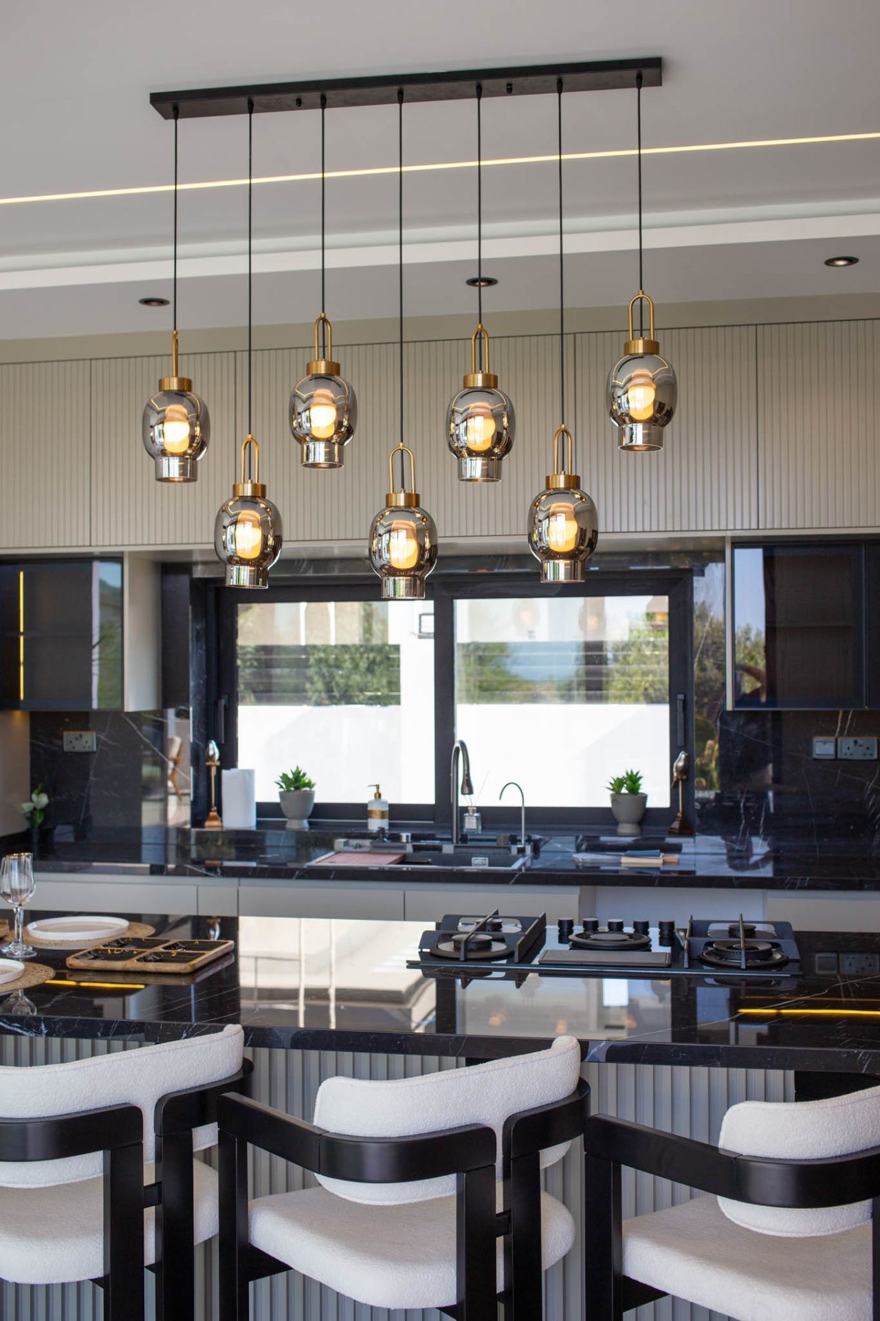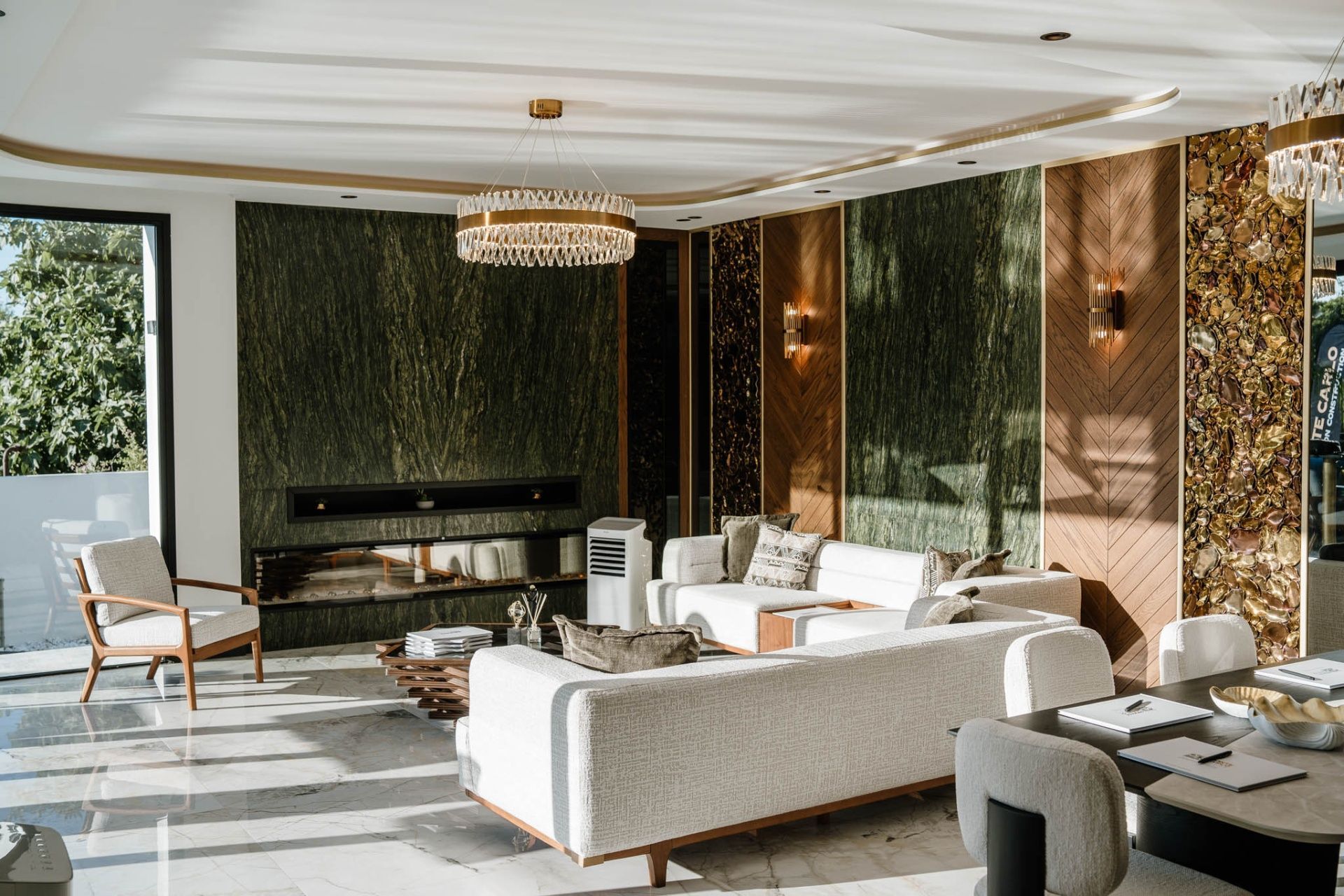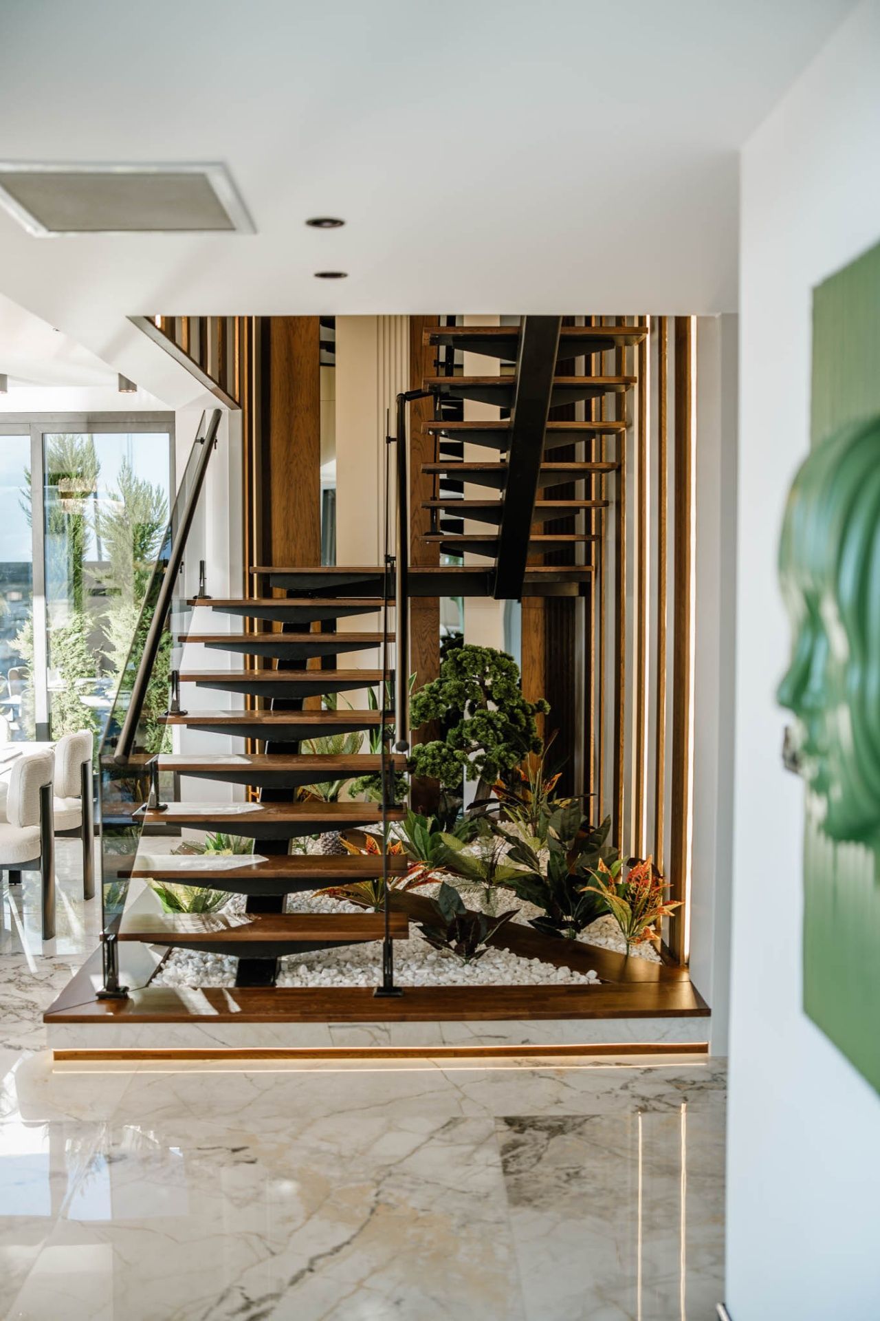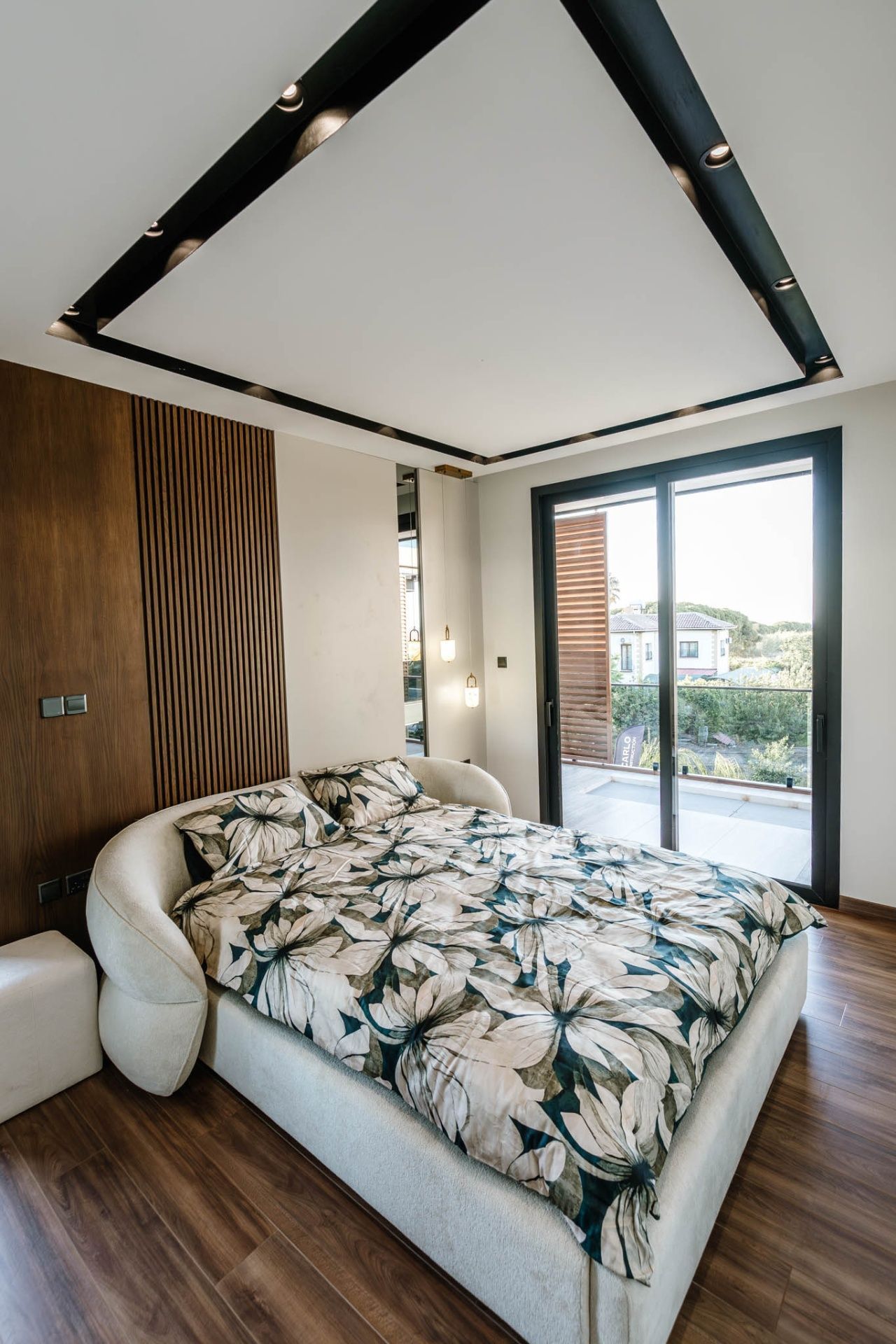 Двухэтажная вилла площадью 264 м² спроектирована в современном архитектурном стиле. На первом этаже просторная гостиная с выходом на террасу и отдельная кухня, выполненная из натурального камня. Всё зонировано так, чтобы пространство оставалось открытым, но приватным, как в лучших интерьерах премиум-отелей. Здесь же расположена гостевая спальня с личным санузлом и гардеробная при входе.