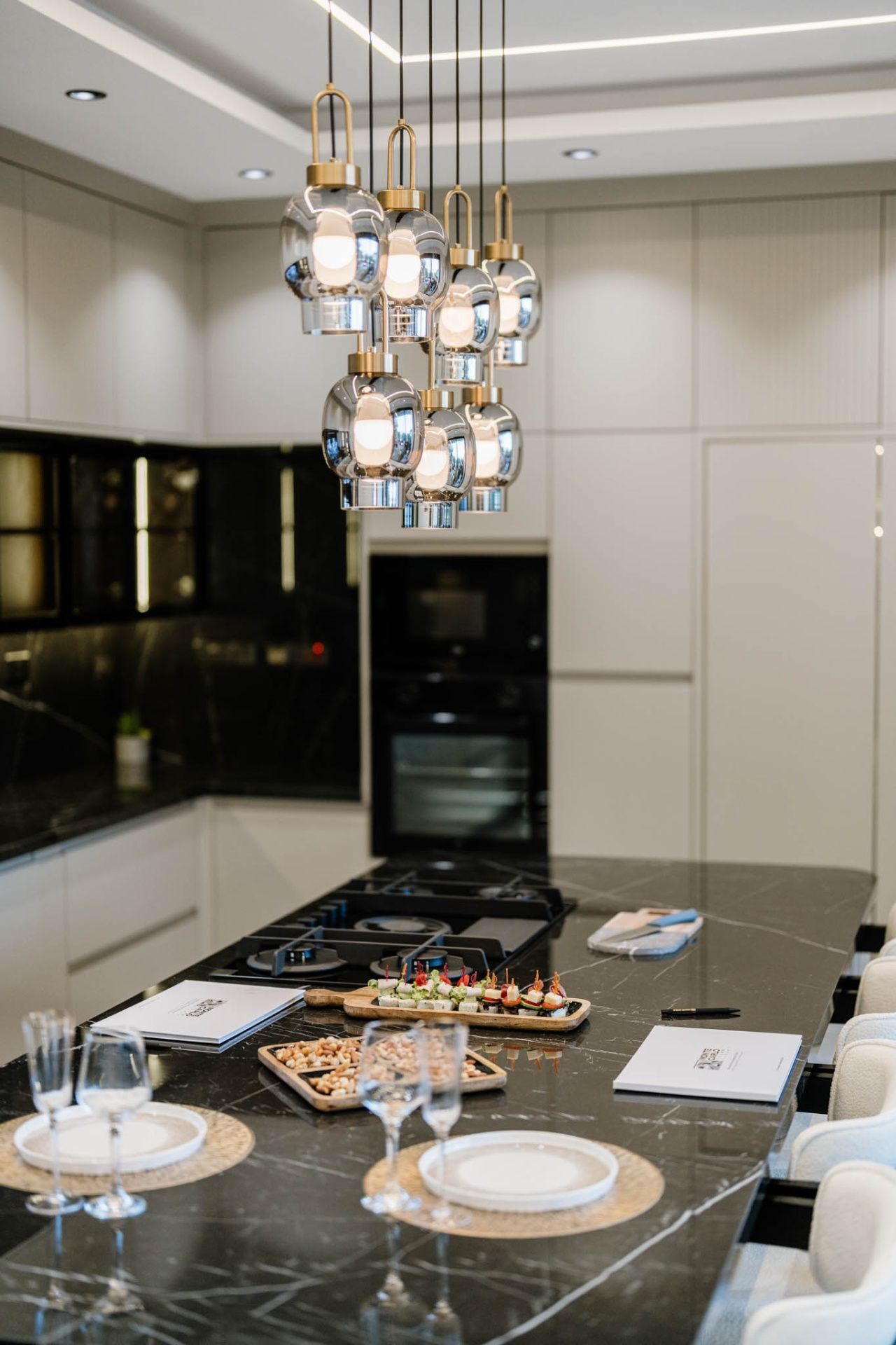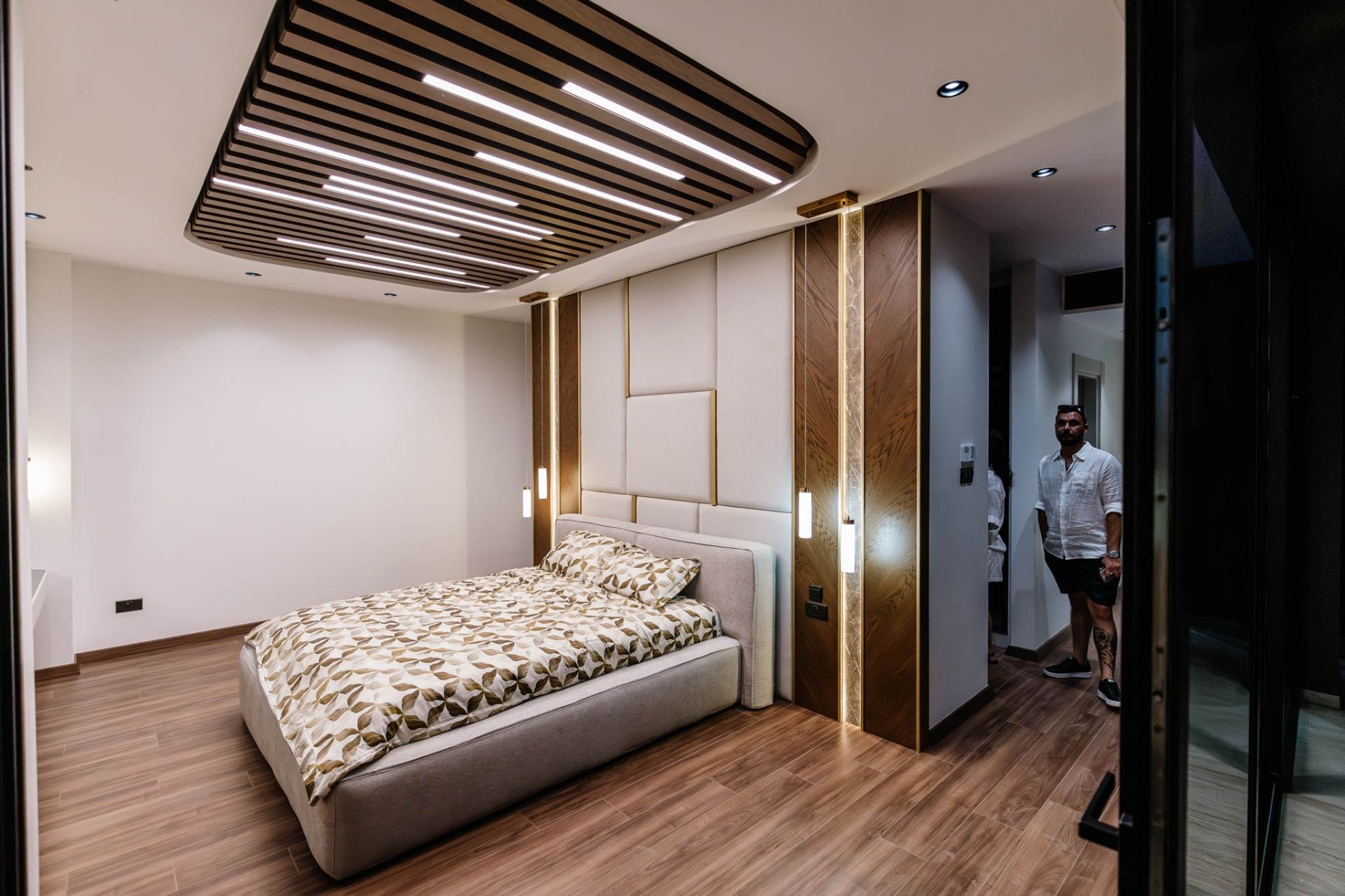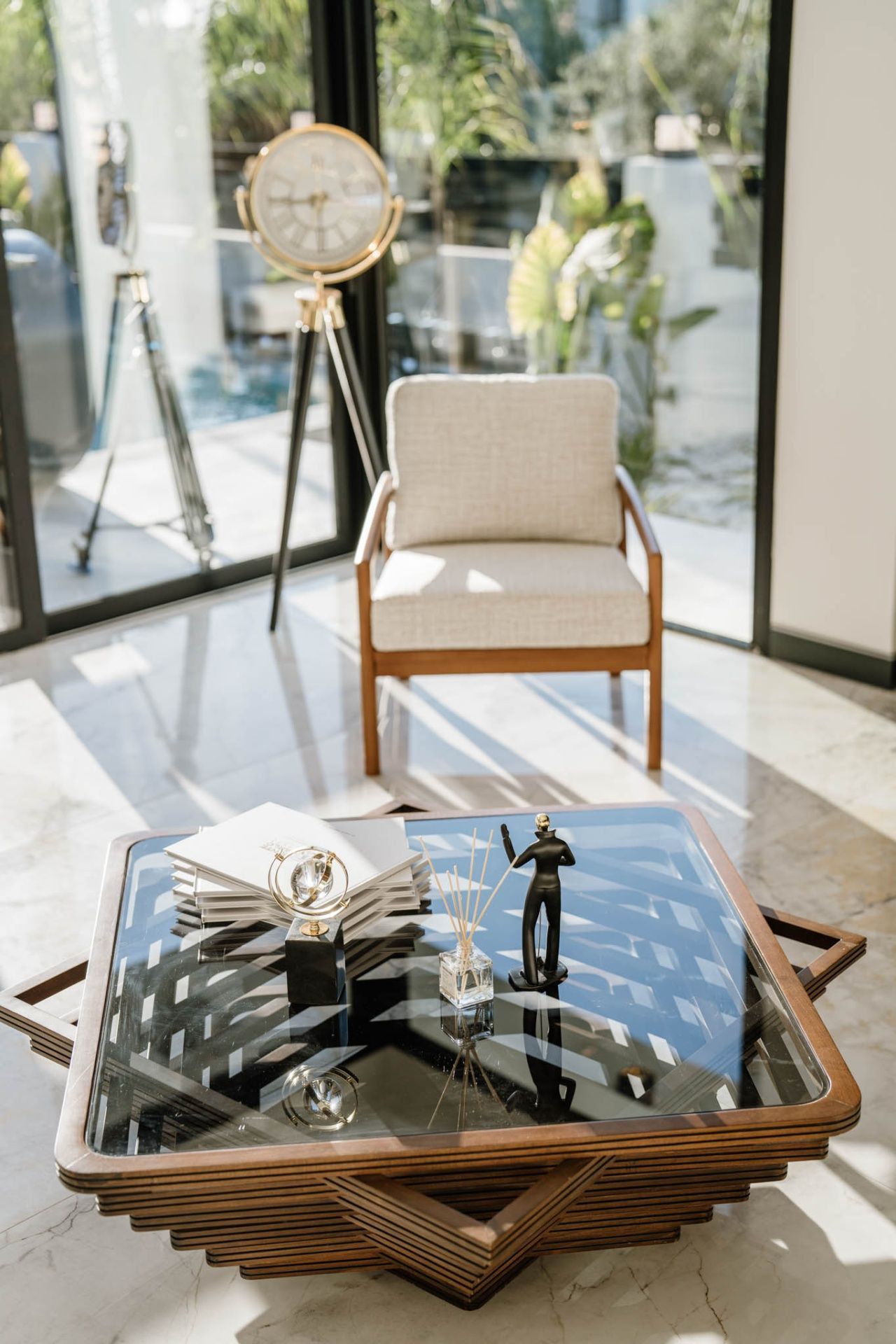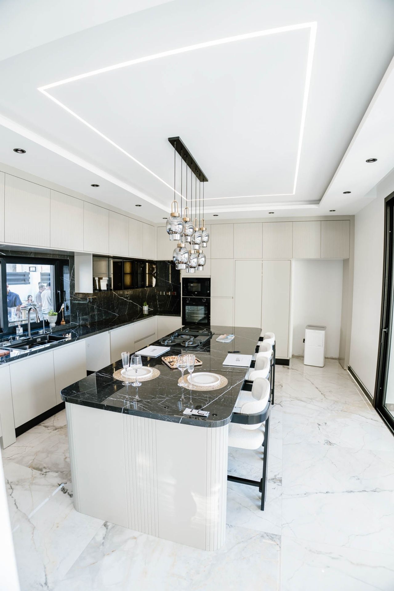 Двухэтажная вилла площадью 264 м² спроектирована в современном архитектурном стиле. На первом этаже просторная гостиная с выходом на террасу и отдельная кухня, выполненная из натурального камня. Всё зонировано так, чтобы пространство оставалось открытым, но приватным, как в лучших интерьерах премиум-отелей. Здесь же расположена гостевая спальня с личным санузлом и гардеробная при входе.