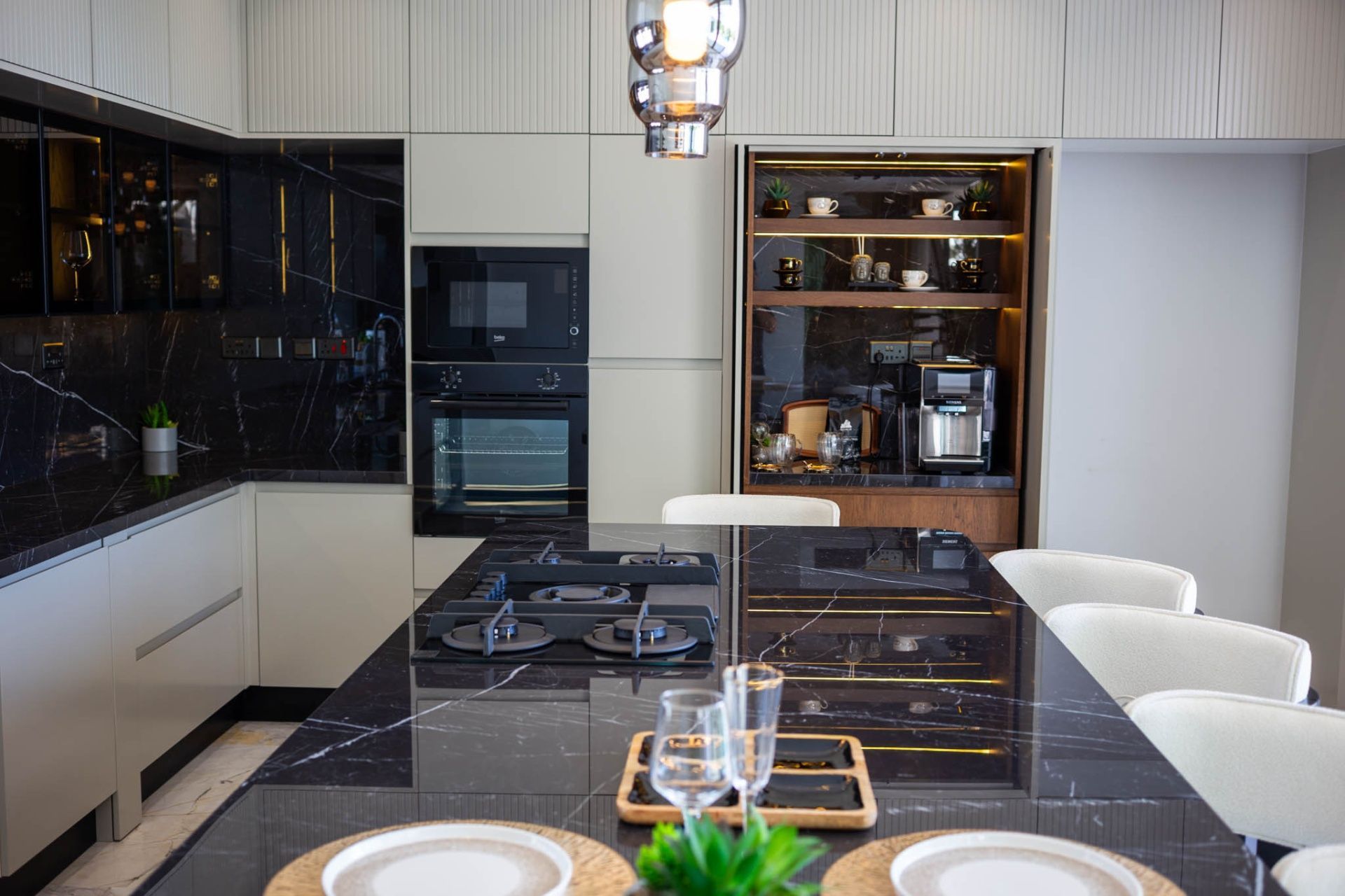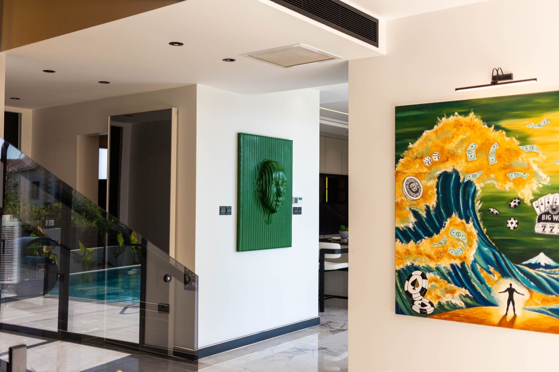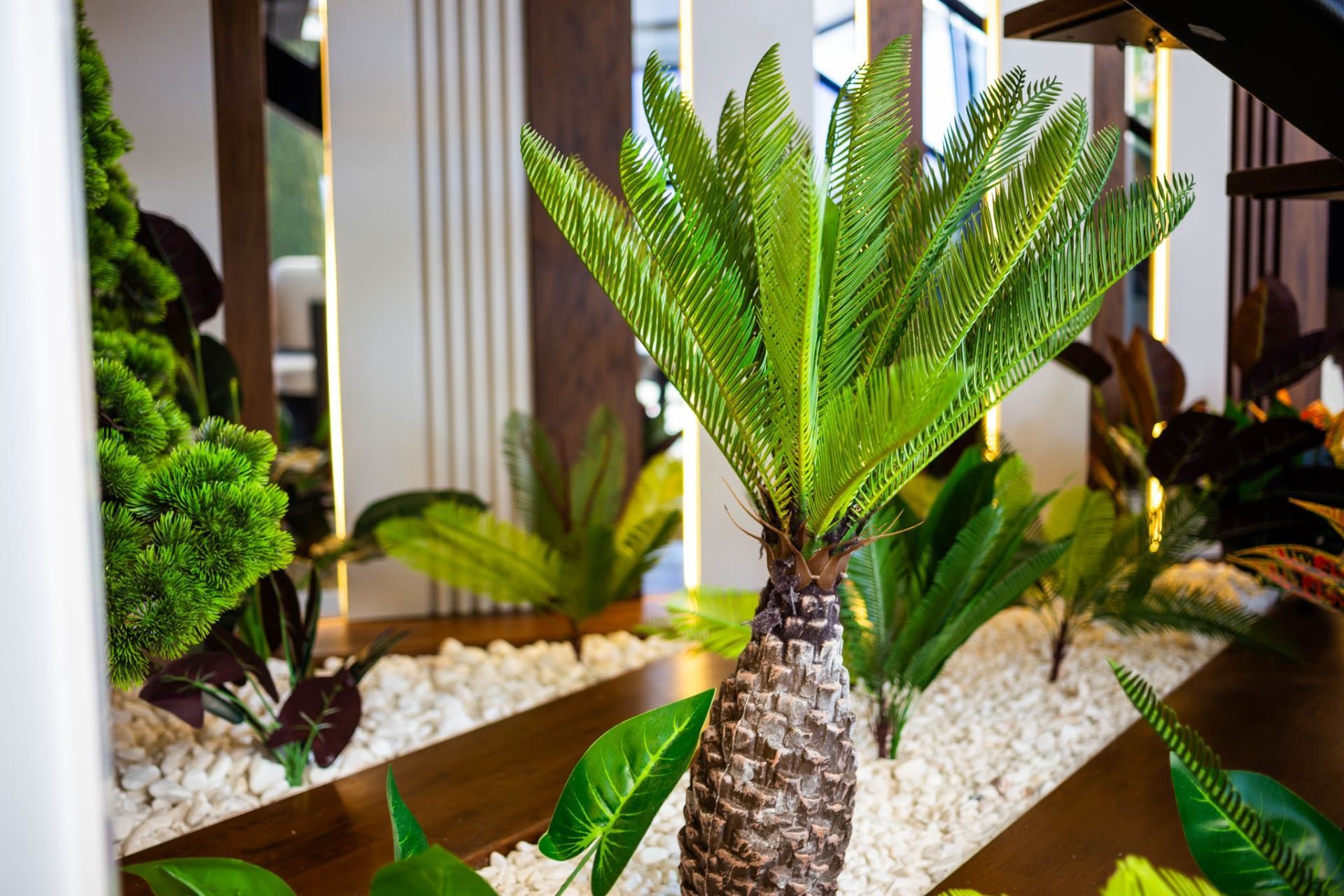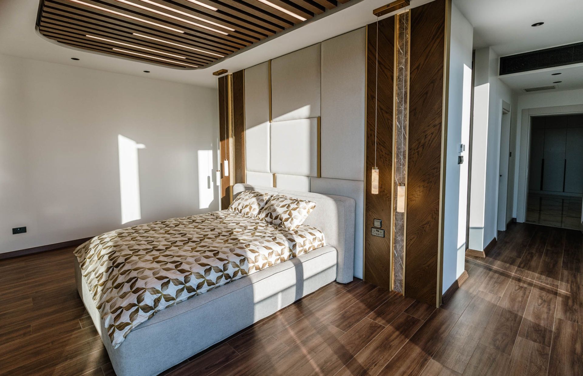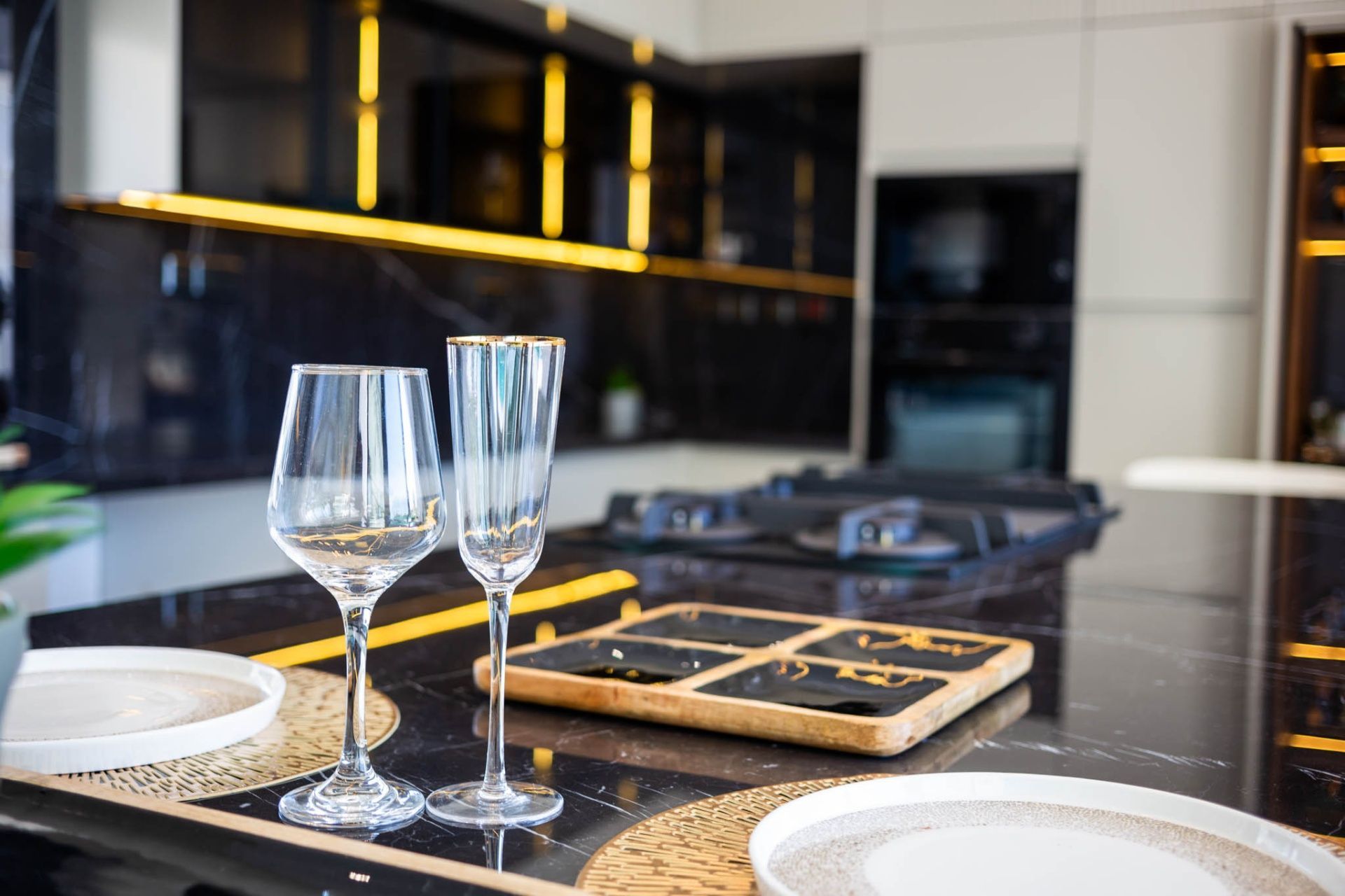 Двухэтажная вилла площадью 264 м² спроектирована в современном архитектурном стиле. На первом этаже просторная гостиная с выходом на террасу и отдельная кухня, выполненная из натурального камня. Всё зонировано так, чтобы пространство оставалось открытым, но приватным, как в лучших интерьерах премиум-отелей. Здесь же расположена гостевая спальня с личным санузлом и гардеробная при входе.