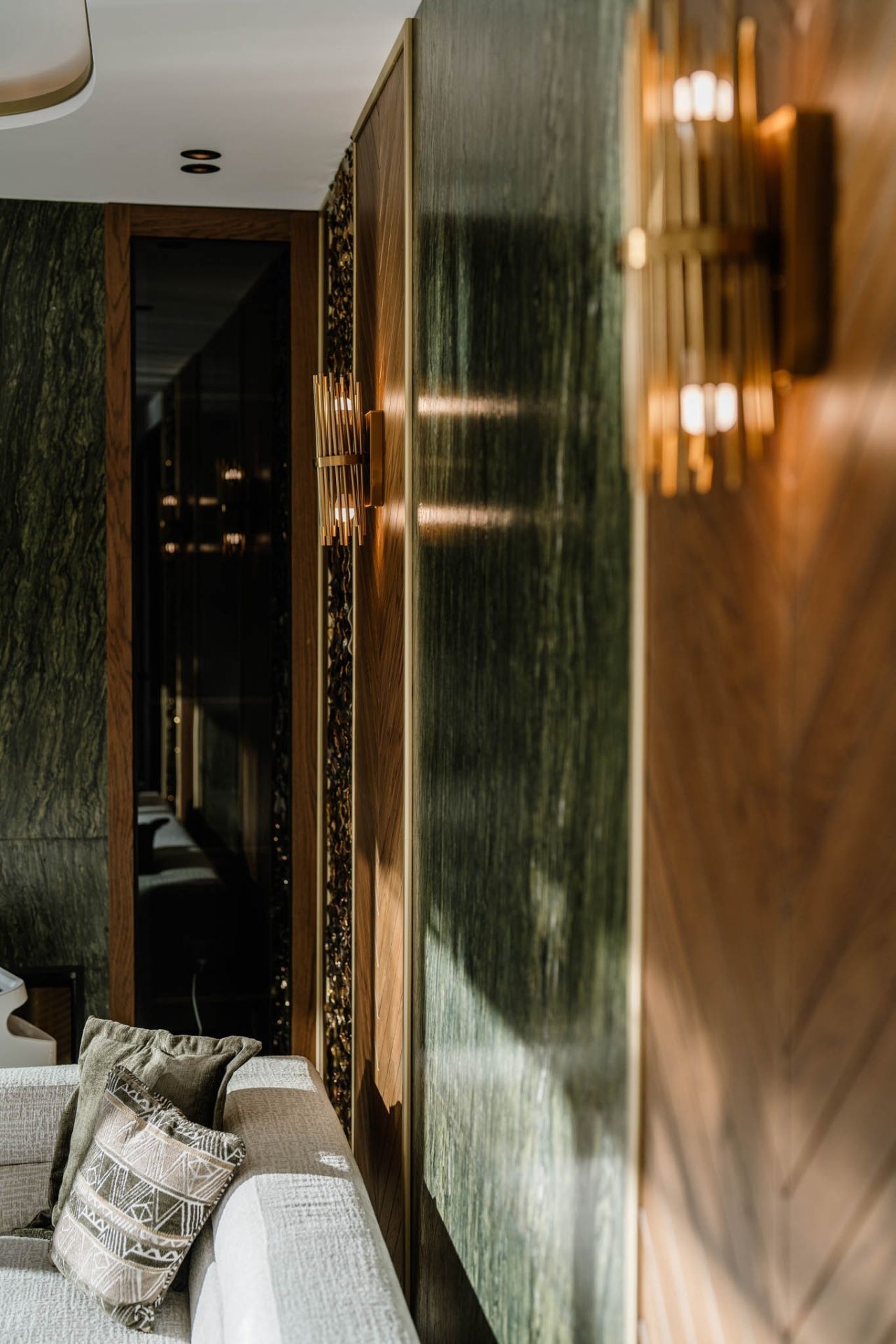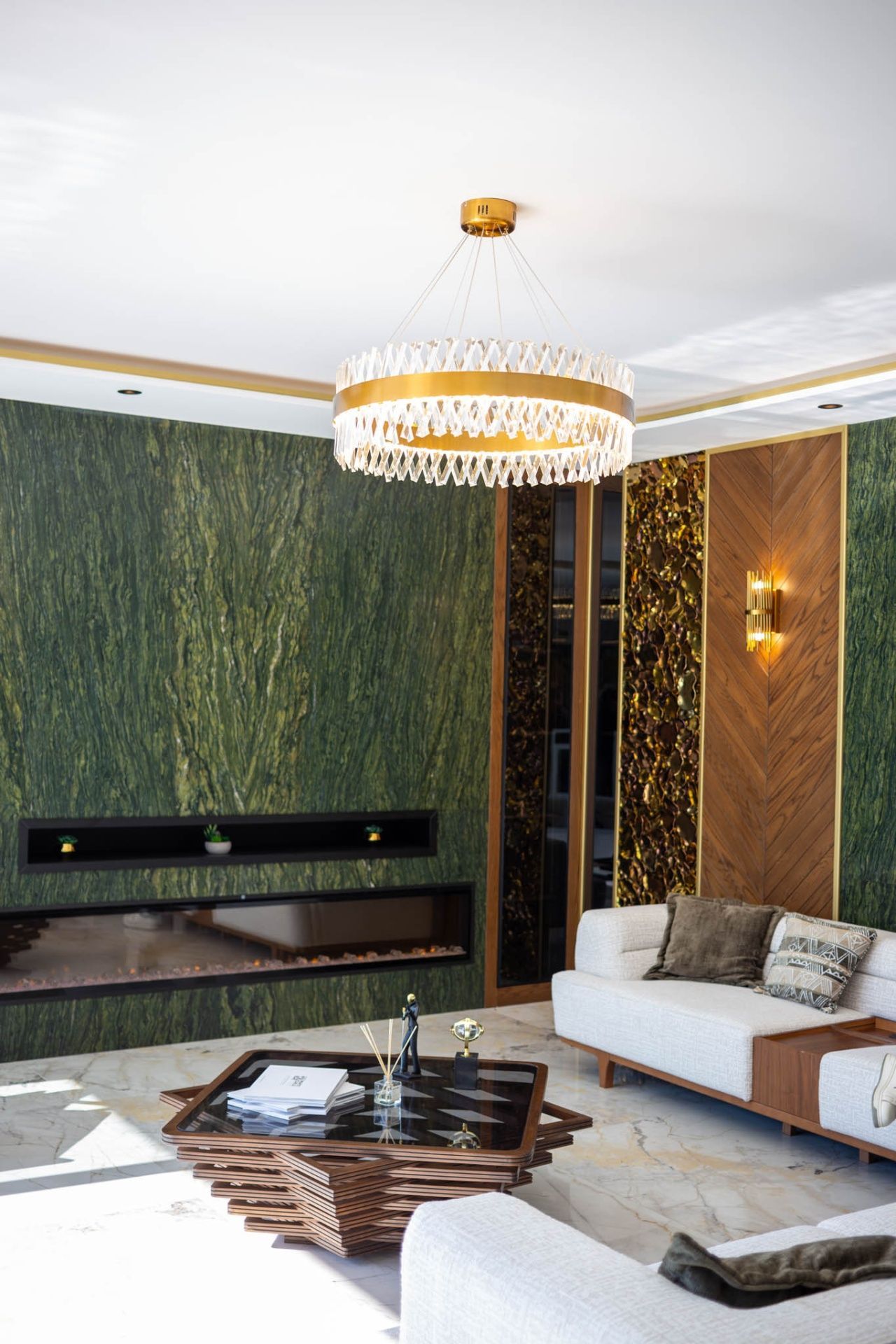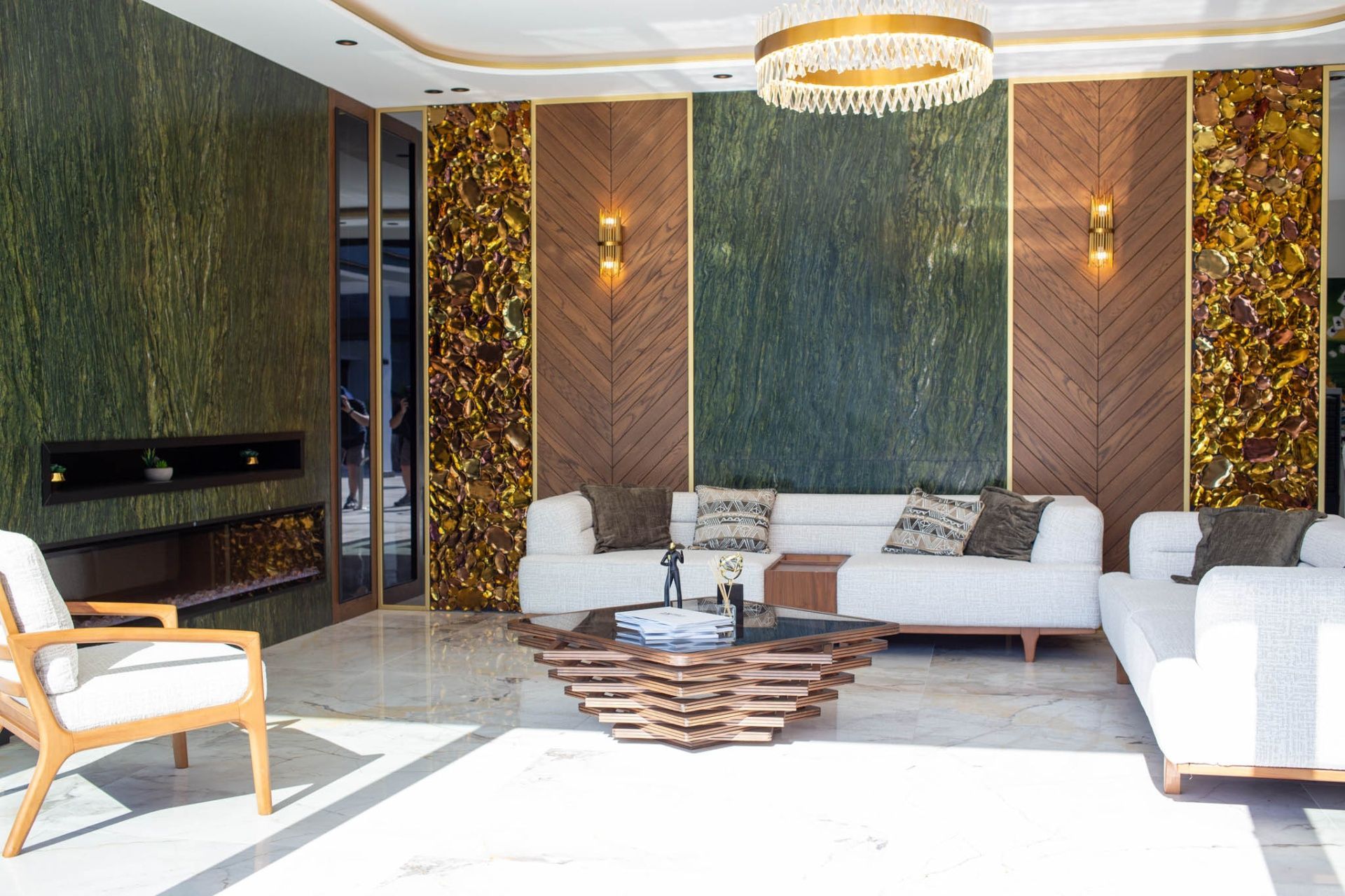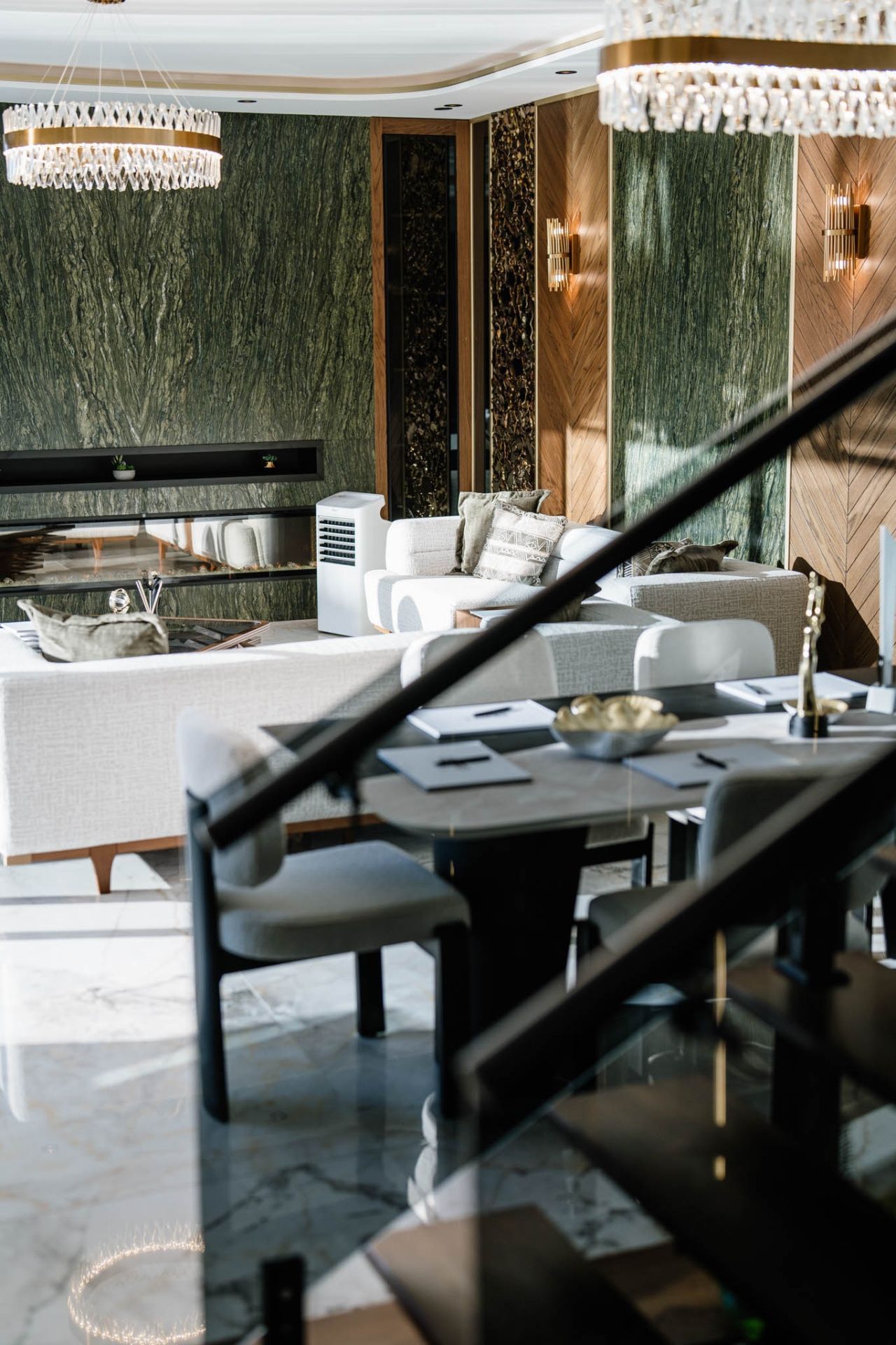 В отделке использованы иранский гранитный мрамор, деревянные панели и испанская плитка. Во всём доме установлена система тёплых полов. Встроенная мебель выполнена на заказ из материалов премиум-класса. Входная дверь с интеллектуальной системой безопасности: отпечаток пальца, пароль и Wi-Fi-управление.