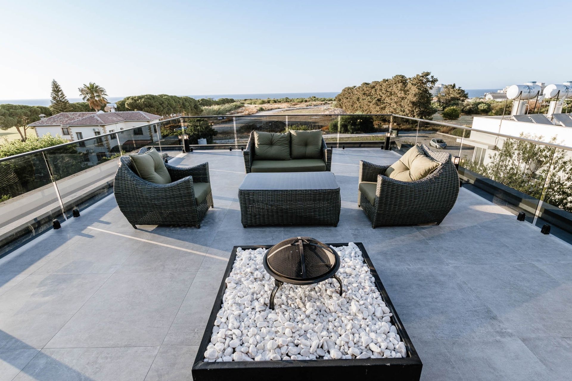 С террасы на крыше открываются панорамные виды на море и горы. Здесь предусмотрены джакузи на восемь человек, барная зона и аккуратно закрытый технический блок, в котором размещено оборудование системы кондиционирования VRF.