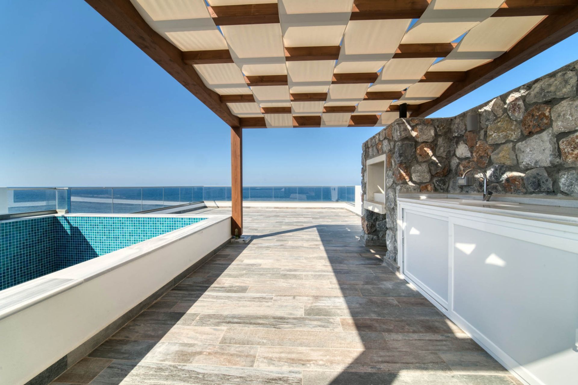 Пентхаус 3+1 общей площадью 104 м² с балконом 10 м² и большой частной террасой на крыше 70 м² с бассейном. Из каждой комнаты открываются невероятные панорамные виды на море. На крыше обустроена полноценная приватная зона отдыха: бассейн 12 м² с подсветкой, душ, барбекю-зона, кухня с каменной столешницей, раковиной, водой и местами для хранения, а также аккуратно отделённая техническая зона с оборудованием от кондиционеров.