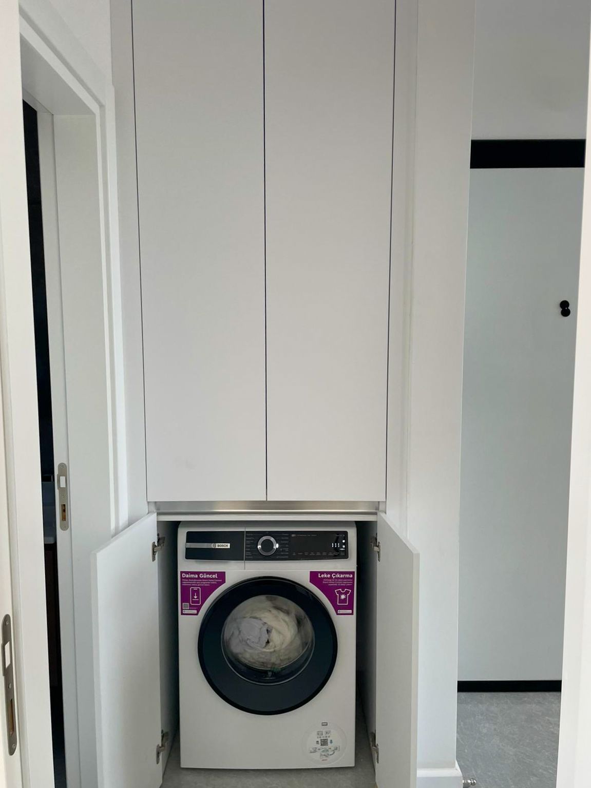 Апартаменты 2+1 площадью 104,5 м² с балконом 9,5 м². Планировка включает просторную гостиную с кухонной зоной, две изолированные спальни, две ванные комнаты и балкон. По всей квартире установлен тёплый пол. Расположены в современном жилом комплексе в зелёном районе Енибогазичи. Архитектура комплекса выдержана в горизонтальном стиле, без высотных зданий, с просторными зелёными участками и большим вниманием к деталям. Здания оформлены в светлом современном стиле с элементами дерева, а более 50% территории занимает озеленение.