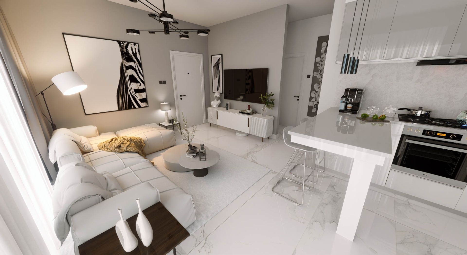 Планировка включает отдельную спальню, гостиную с кухонной зоной, ванную комнату и балкон. В Лапте хорошо развита инфраструктура: рядом расположены супермаркеты, кафе, рестораны, аптеки, школы и остановки общественного транспорта, есть удобное сообщение с Киренией и другими районами побережья.