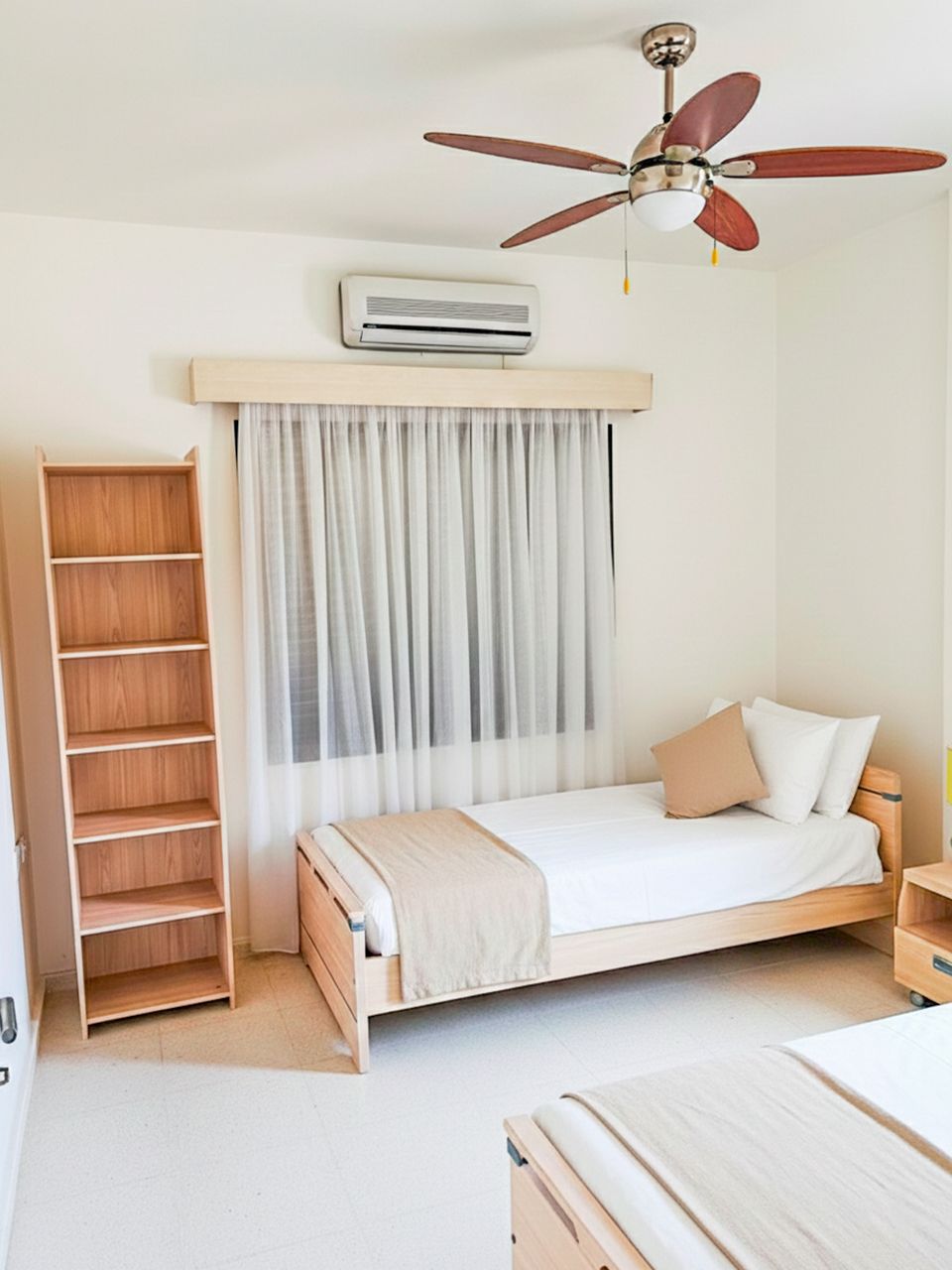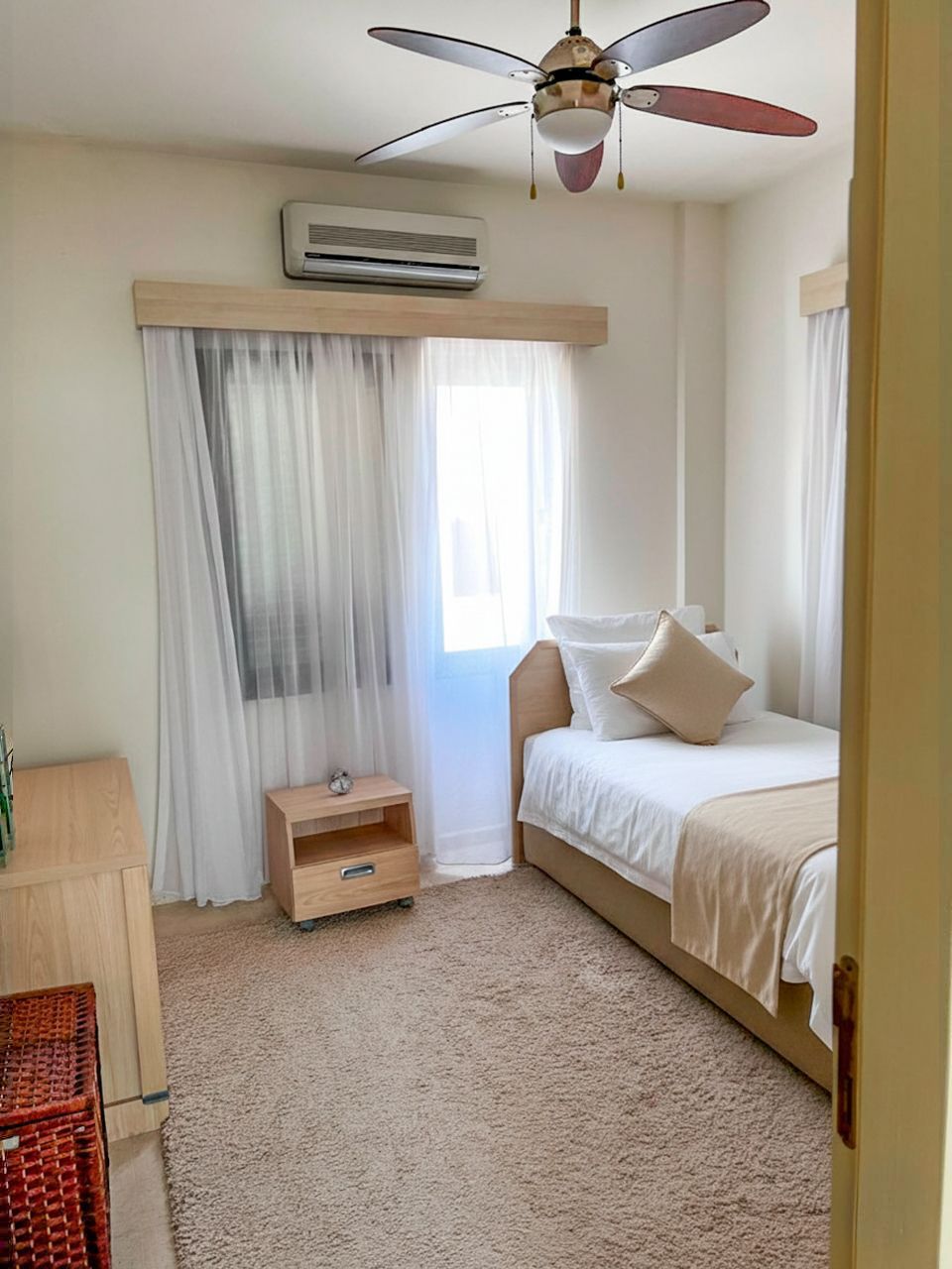 Второй этаж отведён под приватную зону. Здесь расположены три спальни, одна из которых мастер-бедрум с собственной туалетной комнатой и душевой. Из спальни есть выход на террасу с видом на море.