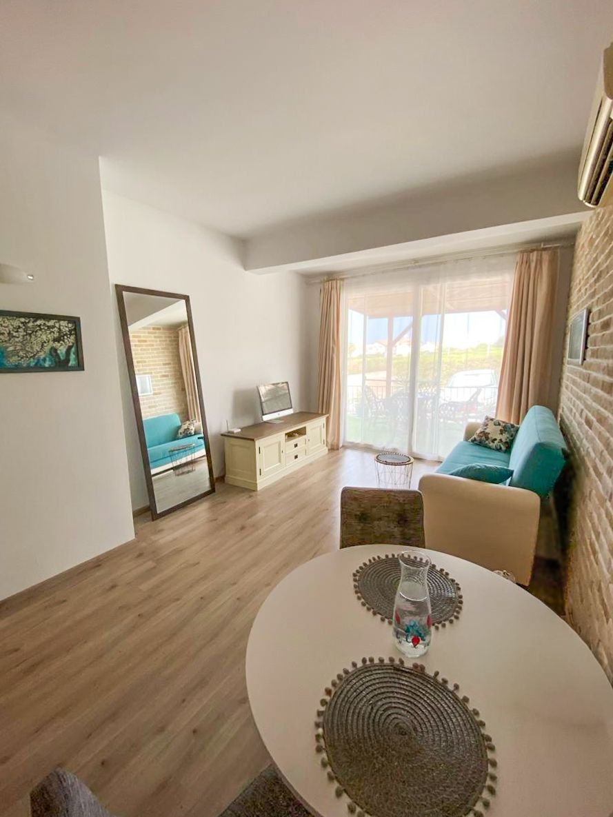 Апартаменты 1+1 площадью 69 м² с видом на море. Просторная гостиная объединена с кухней, из панорамных дверей есть выход на террасу с зелёной зоной и красивым видом на Средиземное море. Квартира полностью меблирована: в гостиной установлен диван, обеденная зона, телевизионная тумба, кухня оборудована всей необходимой техникой: плитой, духовкой, вытяжкой, холодильником и посудомоечной машиной. Спальня оформлена в спокойных тонах, с большой кроватью, шкафом и кондиционером. НДС и Подключение коммуникаций включены в цену.