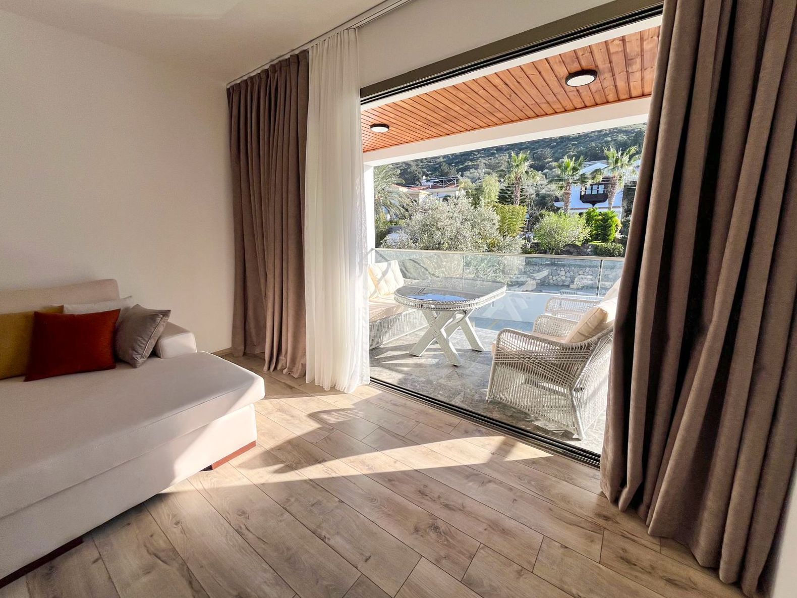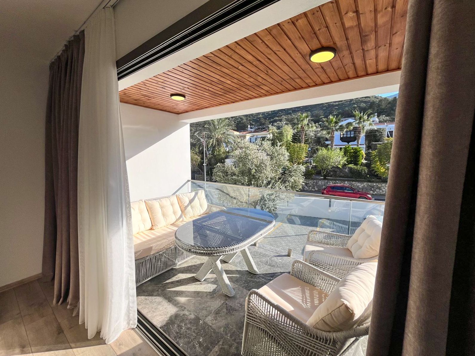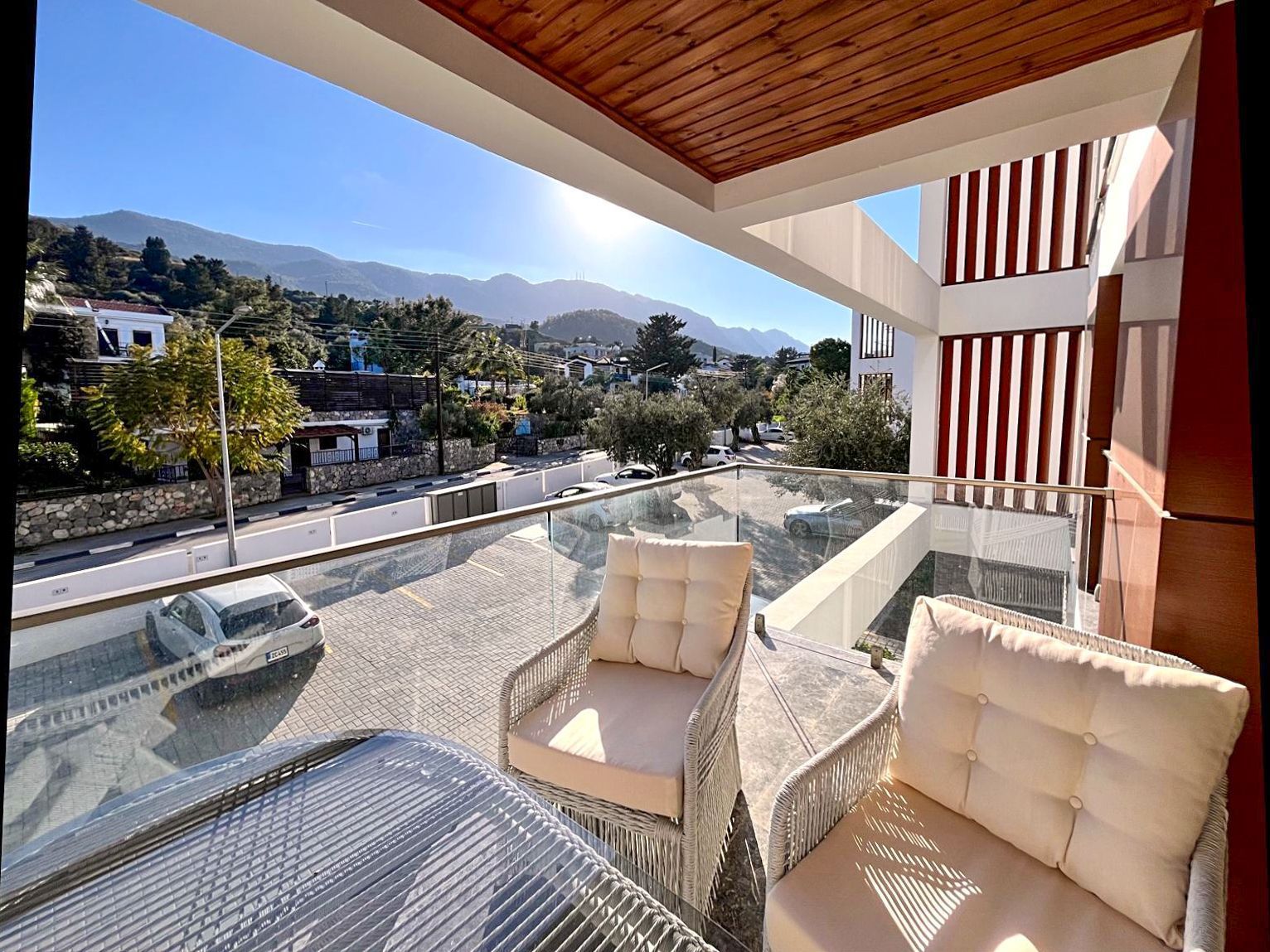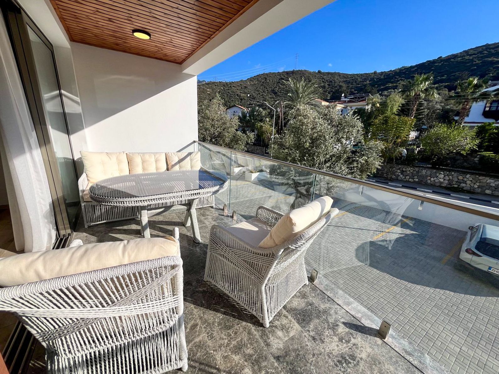 Просторная терраса с деревянным потолком и стеклянным ограждением обустроена полноценной зоной отдыха: плетёная мебель с мягкими подушками. Отсюда открывается панорама на горы и зелёные кроны деревьев.