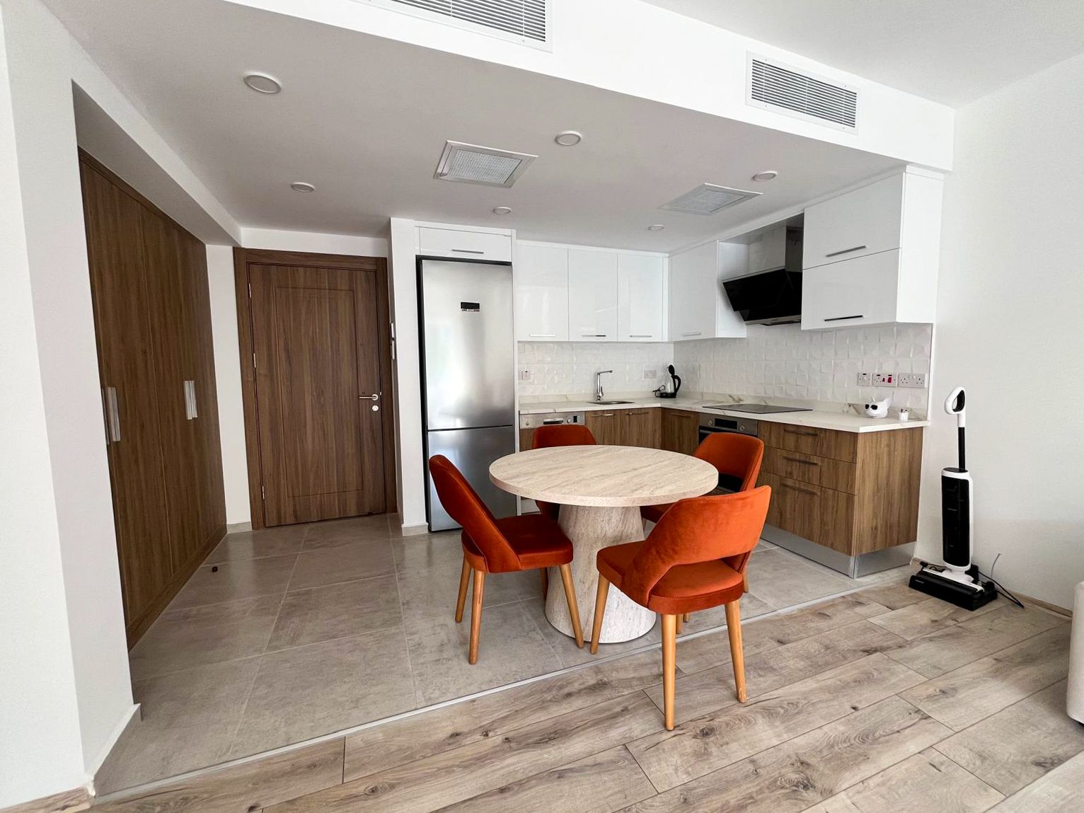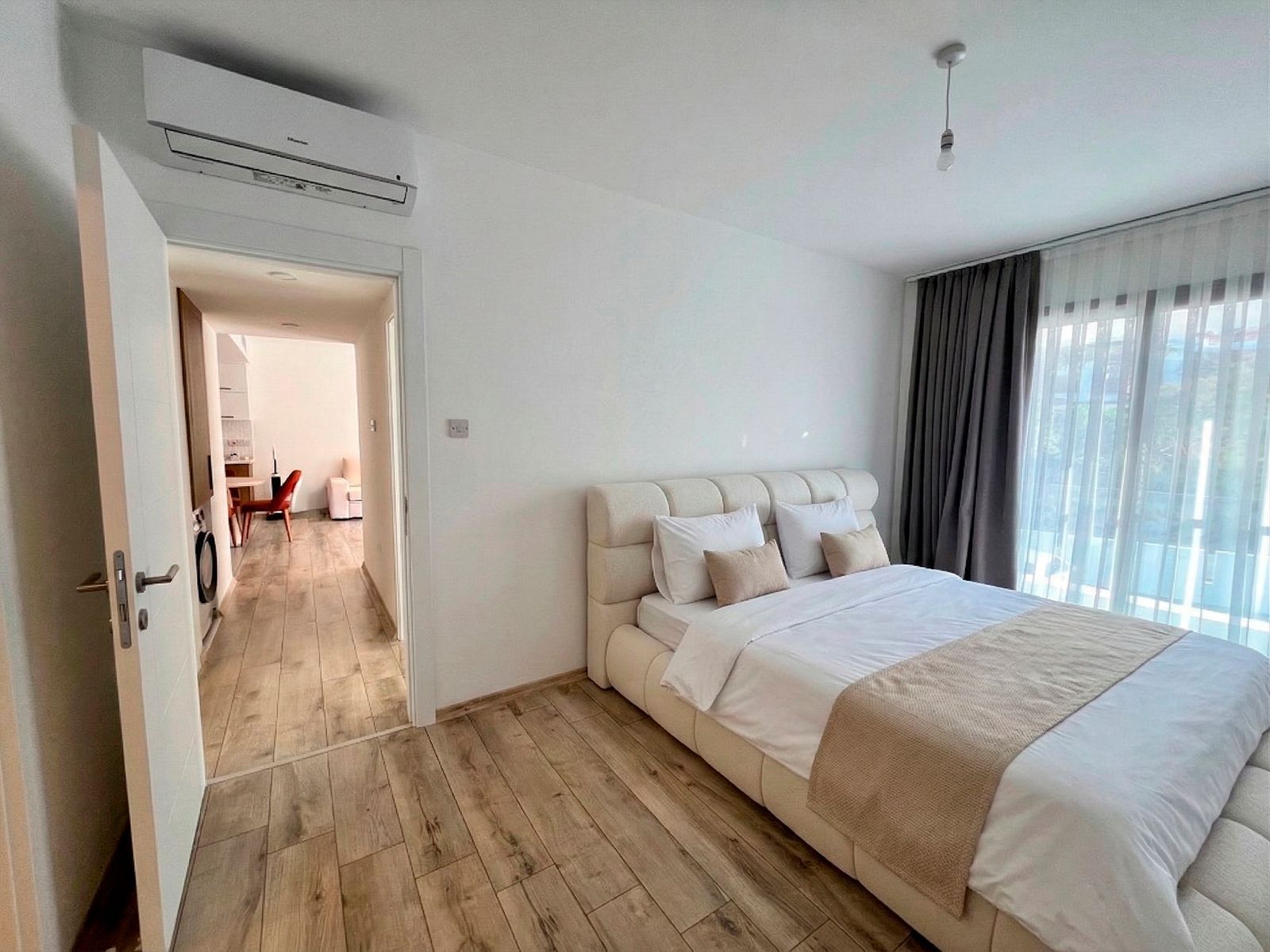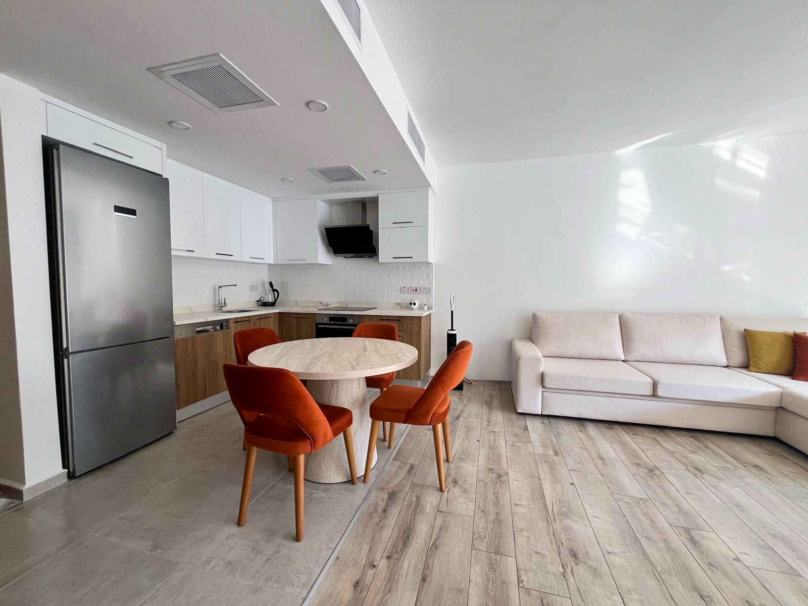 Просторные апартаменты формата 2+1 площадью 99 м², из окон открывается живописный вид на горы. Открытая планировка объединяет кухню, обеденную зону и гостиную. Кухня оснащена полным комплектом техники Bosch: холодильник, духовой шкаф, встроенная варочная поверхность и вытяжка. В гостиной качественный угловой диван, который раскладывается. Панорамное остекление с выходом на террасу наполняет квартиру дневным светом и визуально расширяет пространство. Также в апартаментах установлена система VRF.