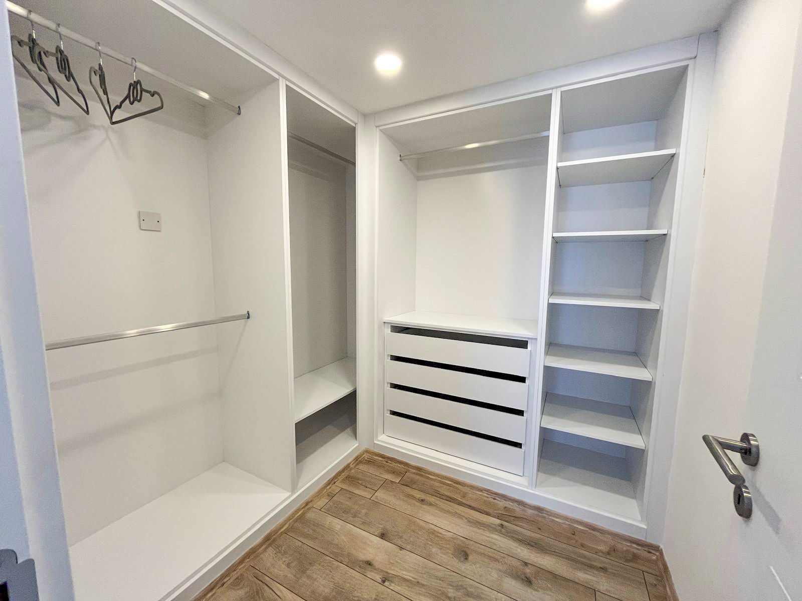 Спальня выдержана в нейтральных тонах: светлый пол, белые стены, широкая двуспальная кровать с мягким изголовьем. Из второго санузла обустроена отдельная гардеробная комната с рейлами, полками и выдвижными ящиками, встроенный шкаф в спальне при этом убран, что освободило дополнительное пространство.