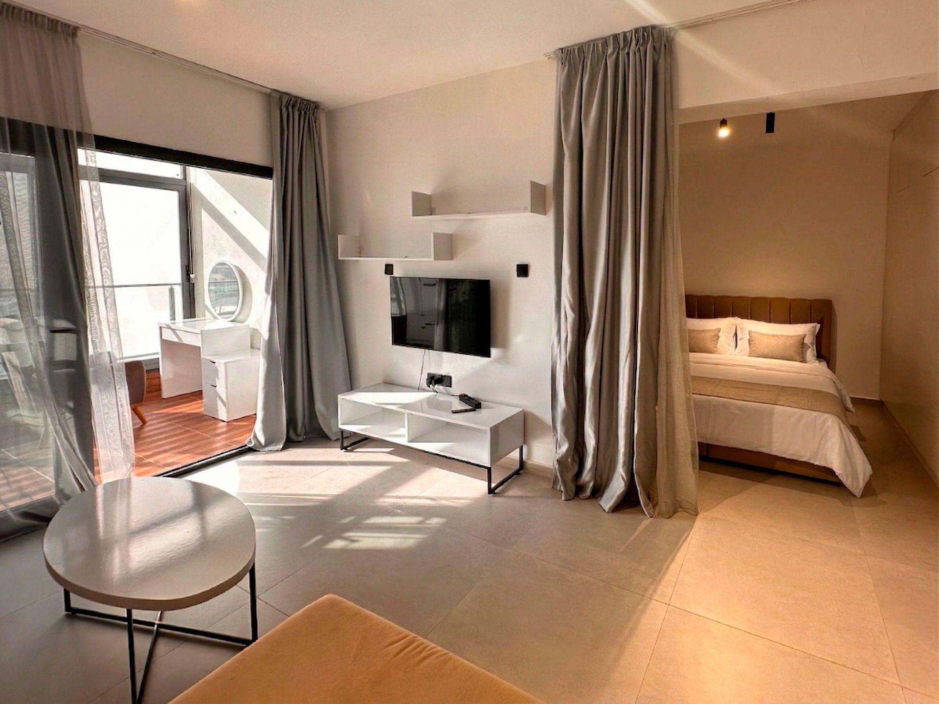 Студия площадью 52 м² с балконом 8,2 м² в курортном комплексе. Планировка с нишей. Балкон полностью застеклён, квартира полностью меблирована и оснащена техникой, диван трансформируется в спальное место, встроенный шкаф обеспечивает достаточно места для вещей. Все предметы новые: современная бытовая техника, жалюзи и шторы, качественный матрас с поддержкой зима-лето. НДС и Подключение коммуникаций включены в цену