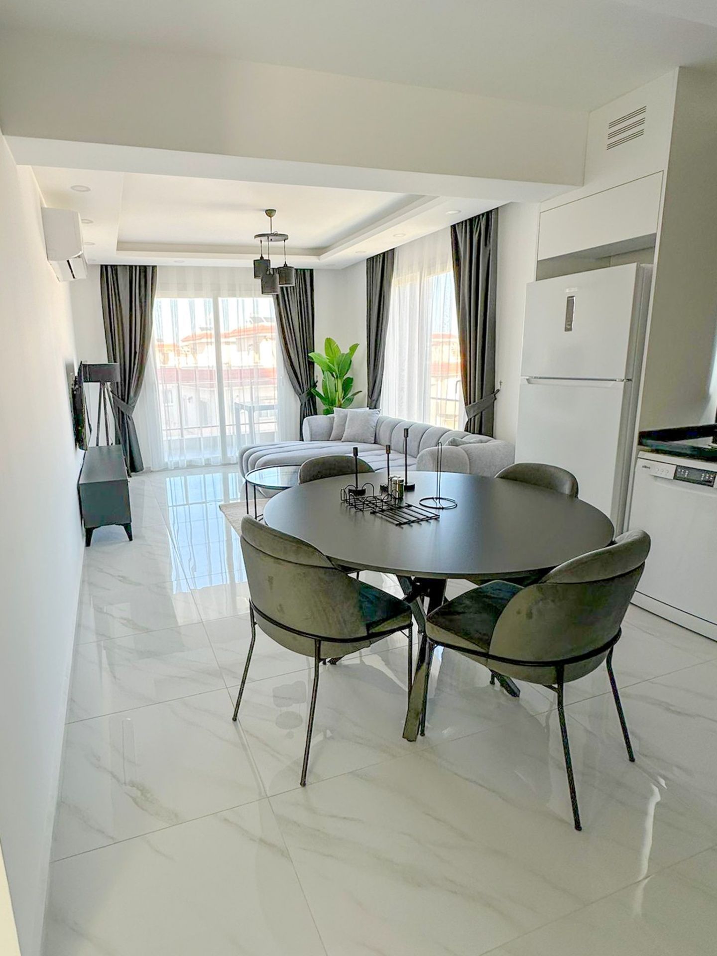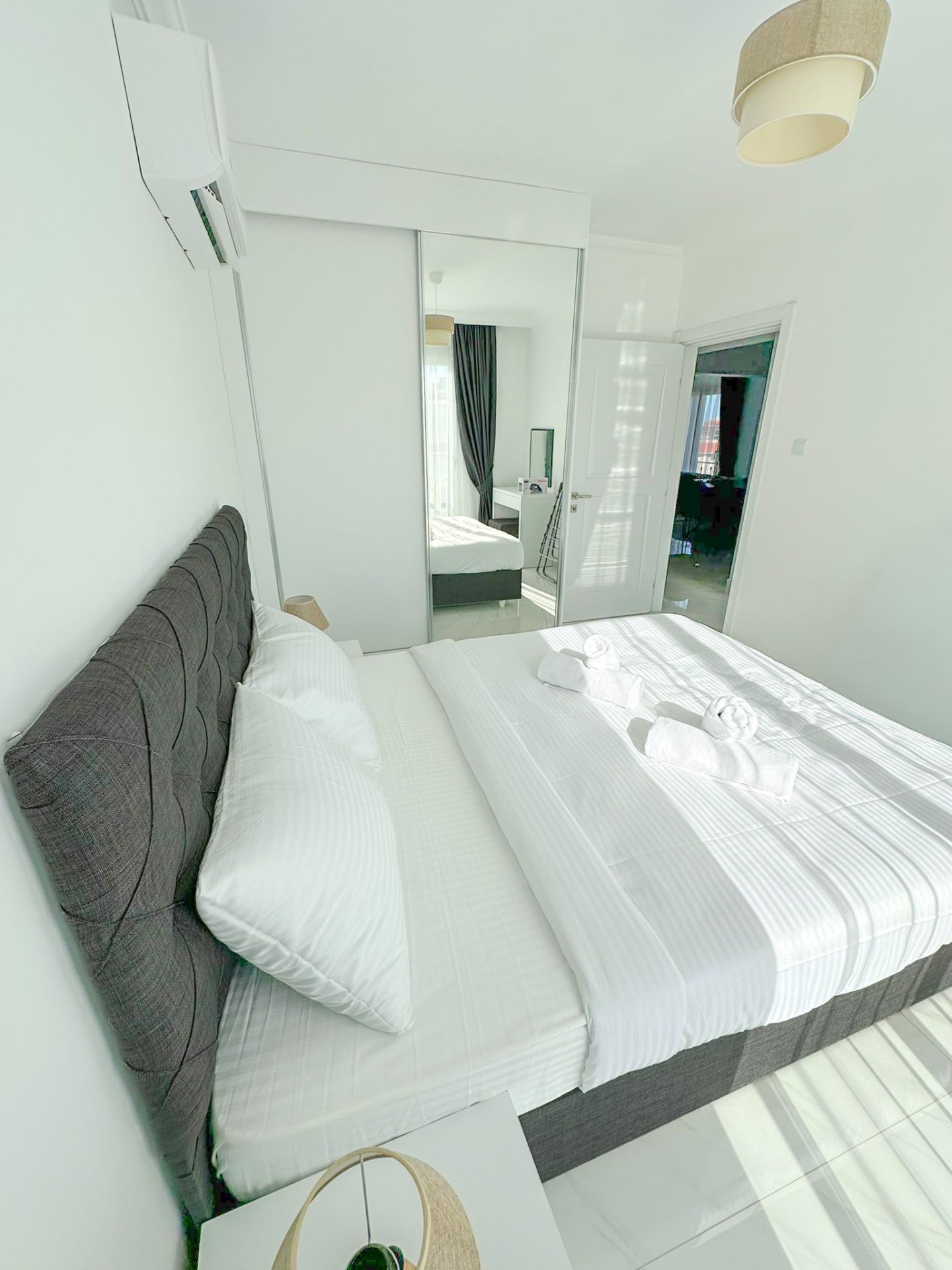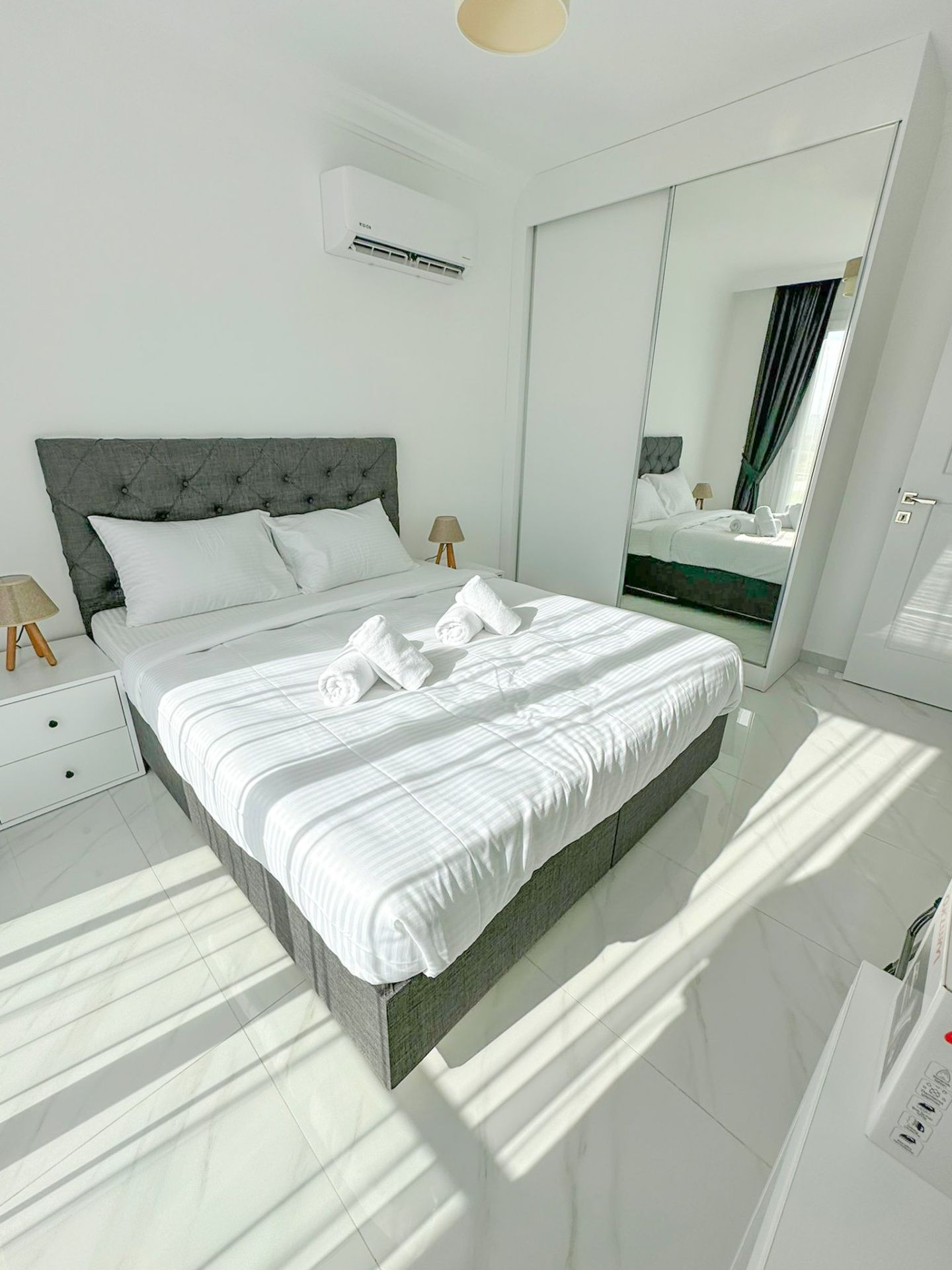 Апартаменты 2+1 общей площадью 79 м² (с балконом 7 м²) полностью меблированы и готовы к проживанию. В гостиной установлен серый модульный диван, журнальный столик и телевизор. Кухня оборудована встроенной техникой: духовкой, газовой плитой, холодильником и вытяжкой, также предусмотрено место под стиральную машину. Главная спальня с панорамными окнами, здесь есть большая кровать с мягким серым изголовьем и встроенный шкаф. Вторая спальня меньше по площади, но также полностью обставлена. В обеих комнатах установлены кондиционеры.