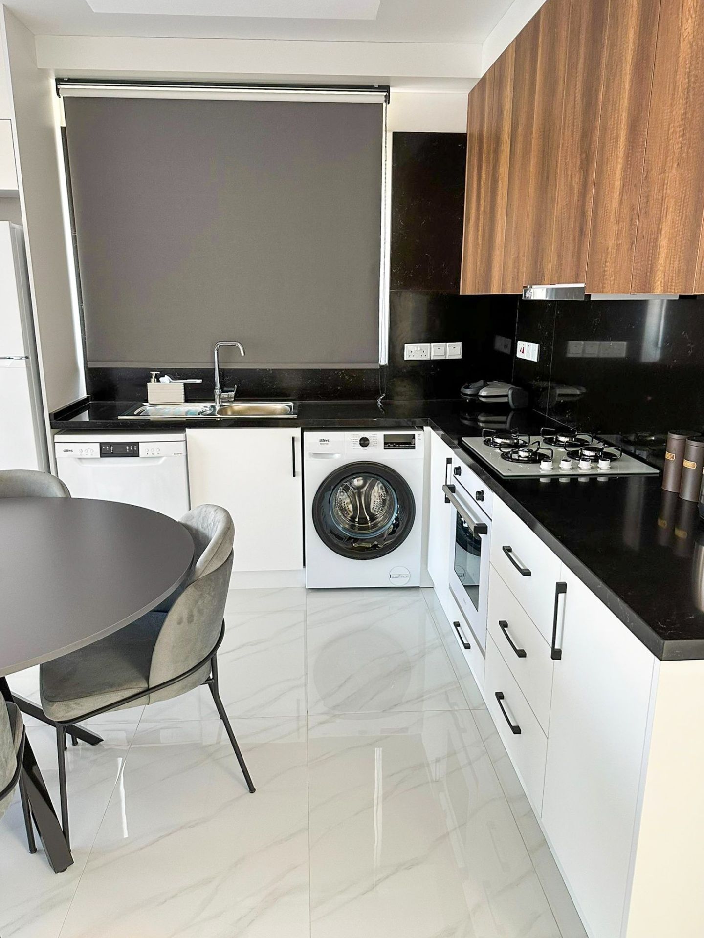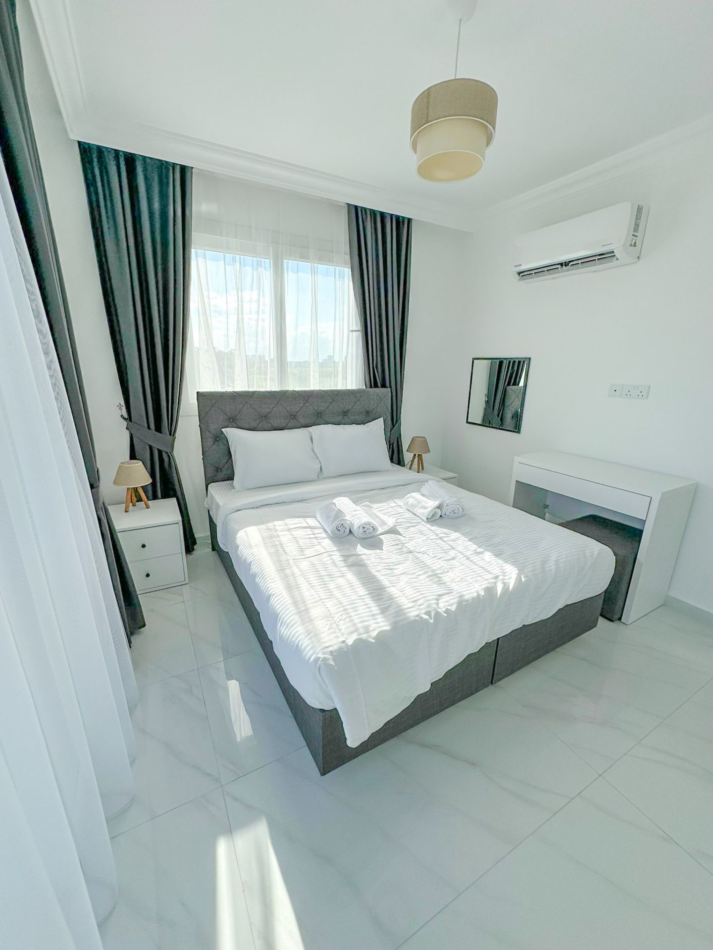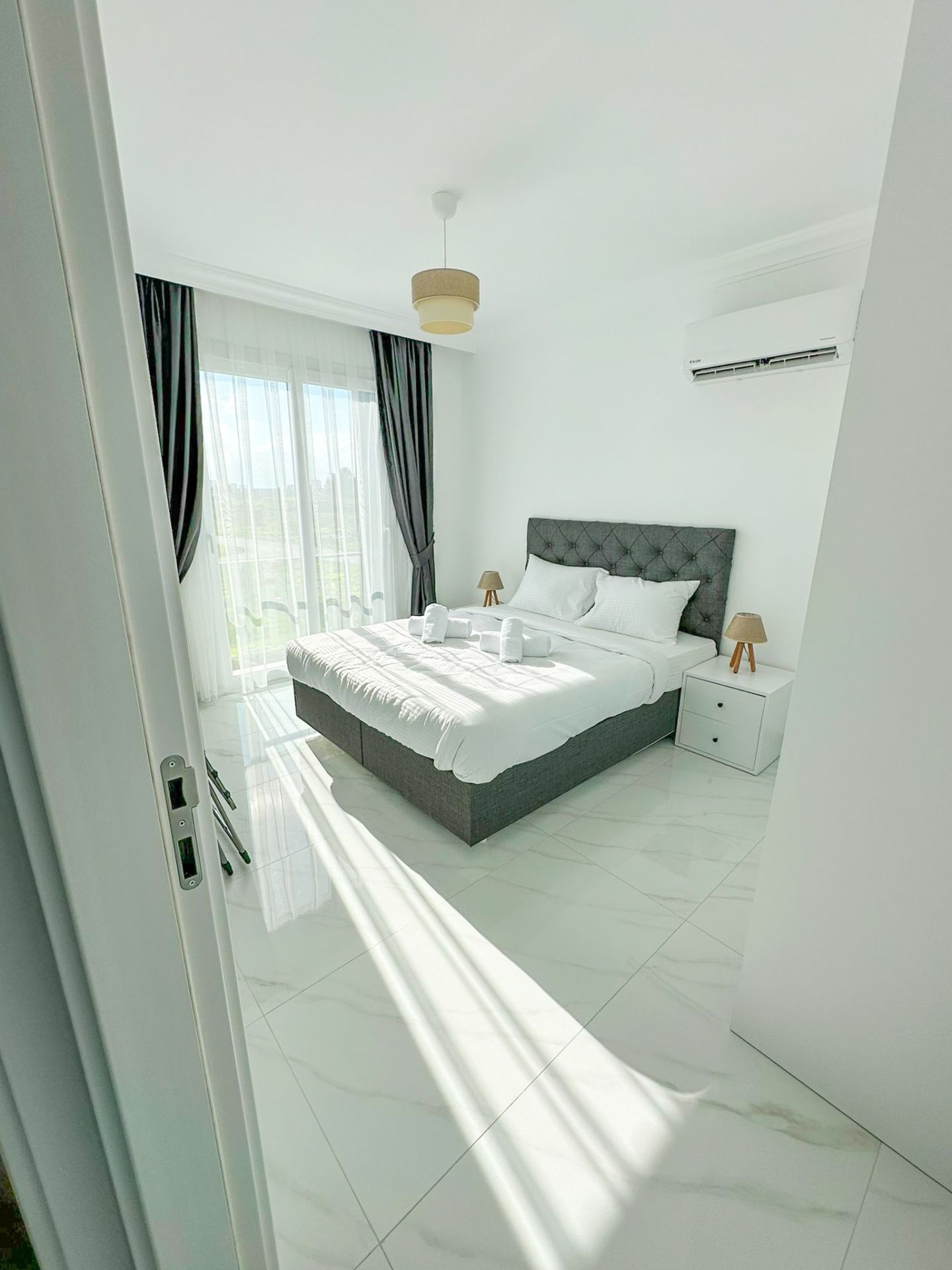 Апартаменты 2+1 общей площадью 79 м² (с балконом 7 м²) полностью меблированы и готовы к проживанию. В гостиной установлен серый модульный диван, журнальный столик и телевизор. Кухня оборудована встроенной техникой: духовкой, газовой плитой, холодильником и вытяжкой, также предусмотрено место под стиральную машину. Главная спальня с панорамными окнами, здесь есть большая кровать с мягким серым изголовьем и встроенный шкаф. Вторая спальня меньше по площади, но также полностью обставлена. В обеих комнатах установлены кондиционеры.